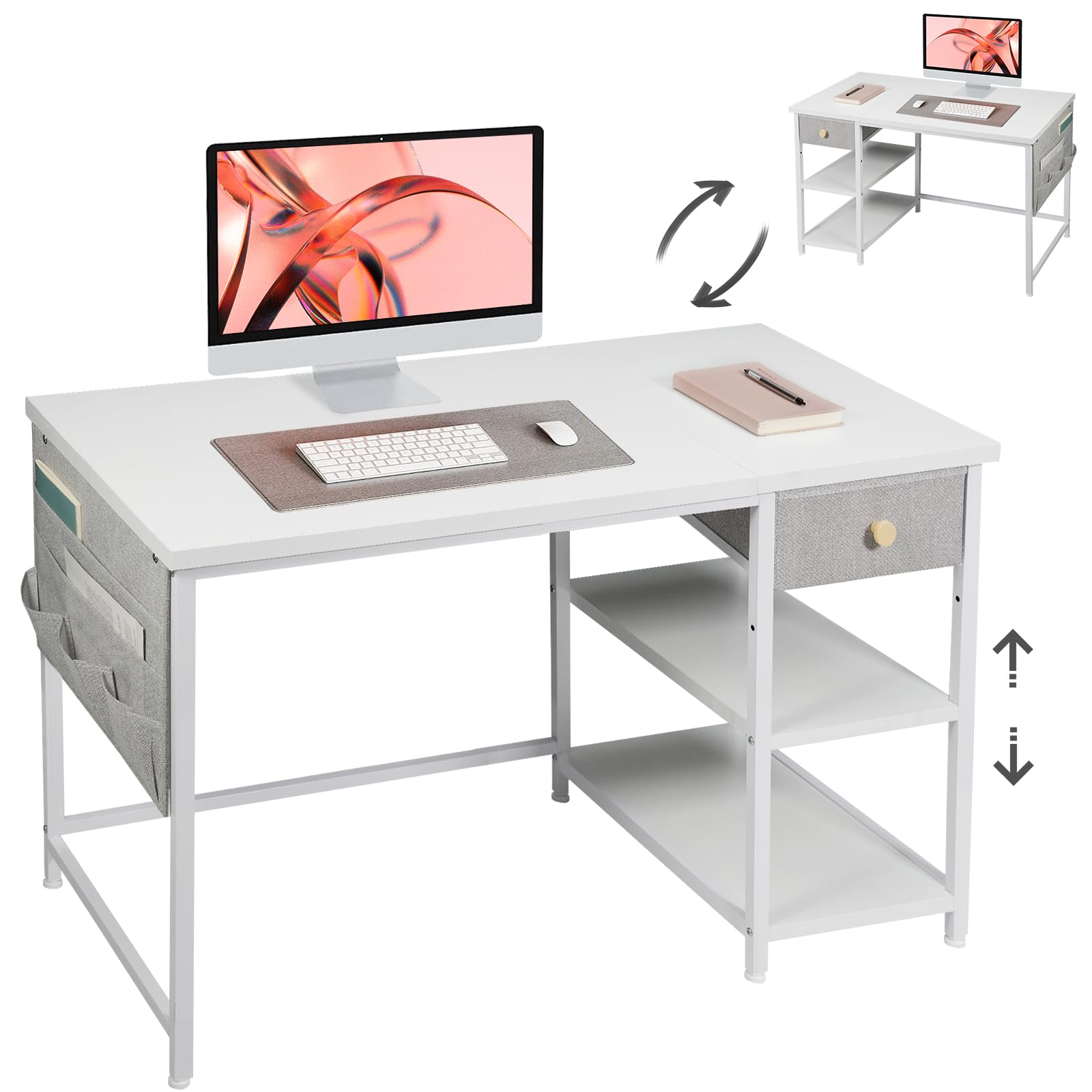 YeTom デスク 机 pcデスク パソコンデスク 勉強机 大人 つくえ ラック付きデスク 幅120cm×奥行55cm 布製引き出し付き 在宅ワークデスク オフィスデスク 収納ラック 収納袋付き 学習机 左右入替可 テレワーク 在宅勤務 白い