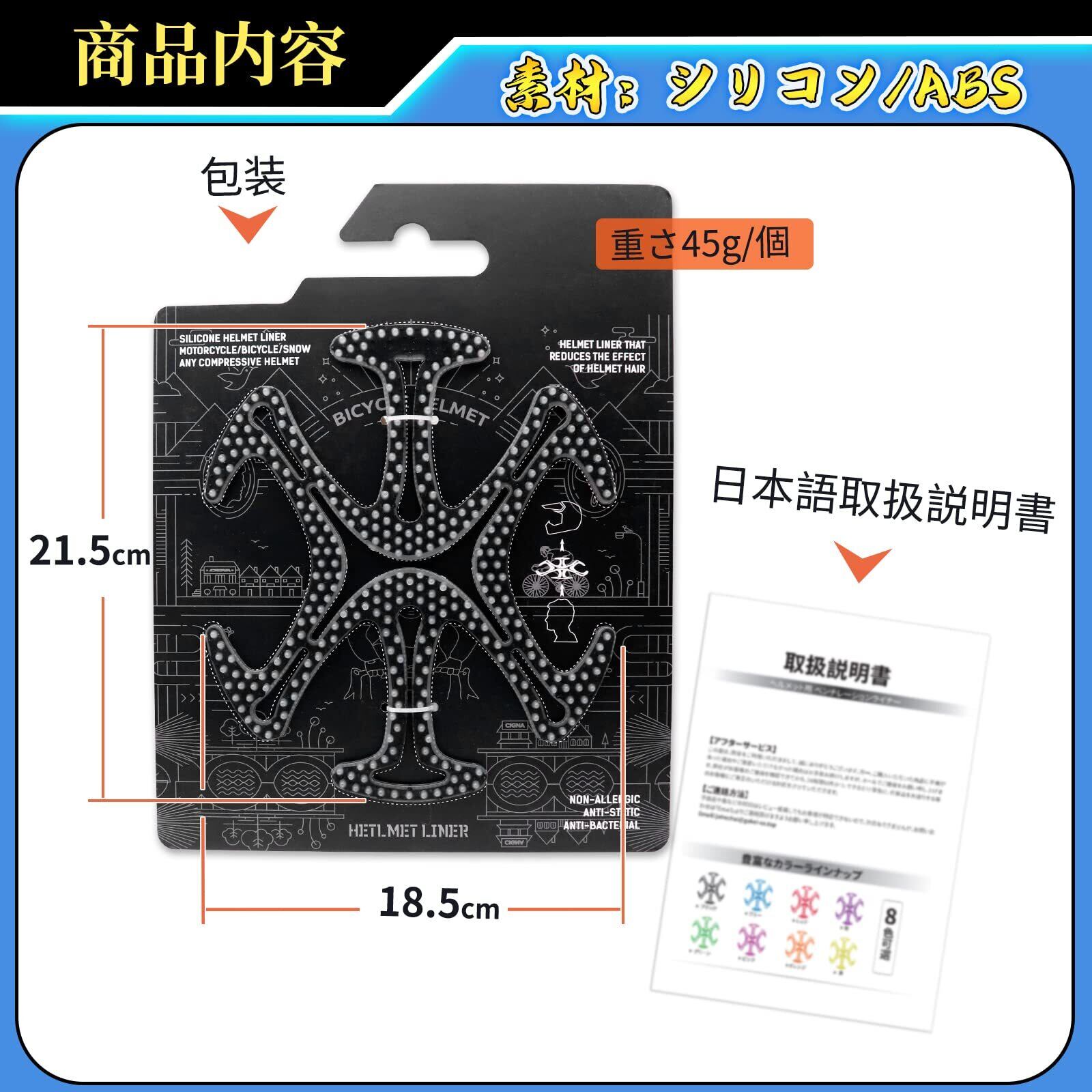 【ヘルメットの悩みを解決】本体の厚さ約8mm 突起部分約5mm 本体サイズ:21.5×18.5×0.8cm 重さ45g/個 素材:シリコン/ABS ヘルメット・頭部どちらにもフィットしやすい柔らかなシリコン素材を採用、ベンチレーションの約5mmの突起部分が髪型の崩れを防ぎ、ヘルメット内部の通気性を高めます。頭部にこもる熱、汗、潰れてします髪、匂い、これらの問題を軽減し、頭蒸れずにスッキリ快適です。ヘルメットと頭皮の間に空間が生まれることで、ヘアースタイルの崩れを最小限に抑える事ができます。