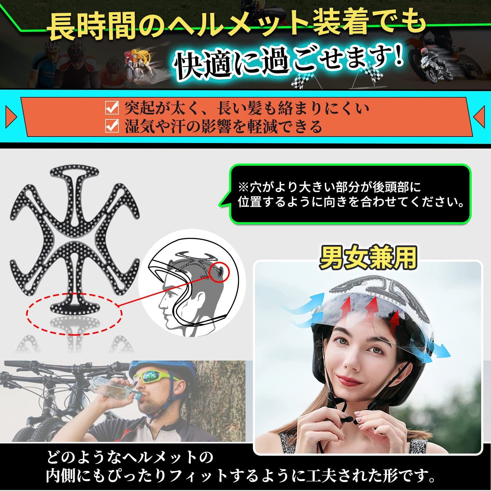 【はめ込み式で簡単装着】取り付けに接着剤やテープが必要なく、突起側が頭皮に当たるように、本製品の平らな面をヘルメットの内側にはめ込んでください。その際、穴がより大きい部分が後頭部に位置するように向きを合わせてください。取り外す際は、そのままヘルメットから剥がしてください。装着時のストレスを軽減し、快適にお過ごしいただけます。基本的にどんなヘルメットにも装着可能です。サイクリングや通勤にはもちろん作業用ヘルメットなど長時間着用する際に大活躍します。