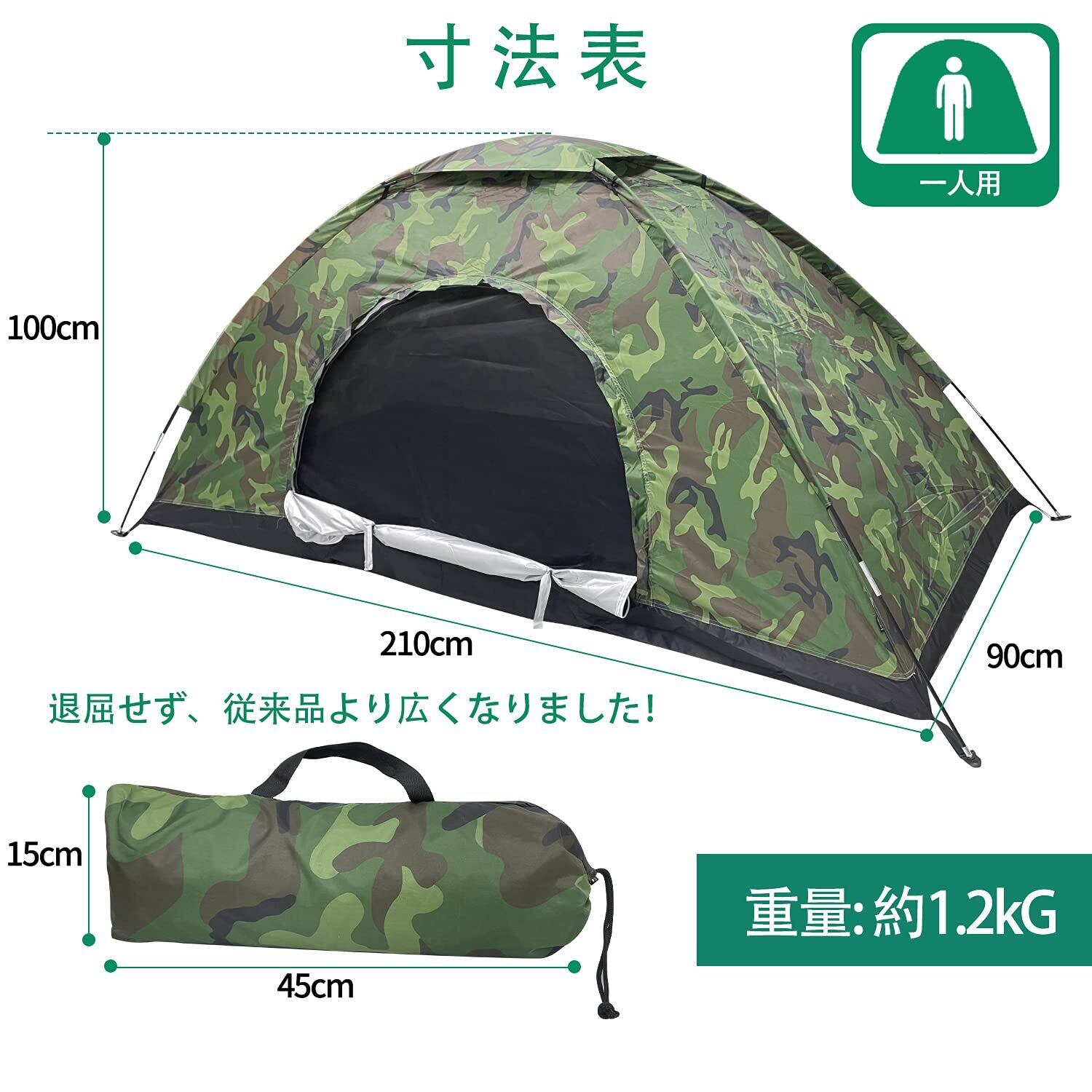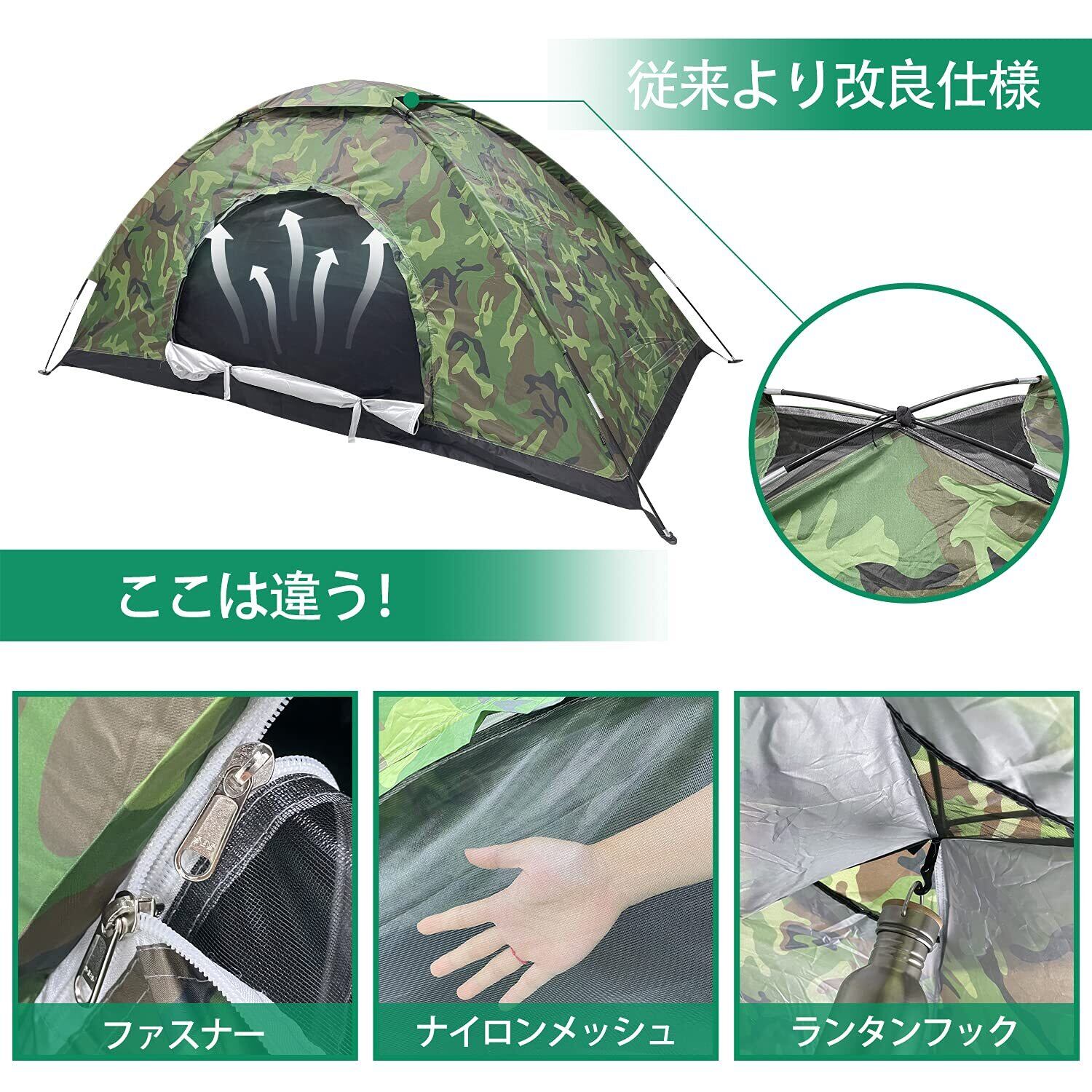 【コスパ抜群】テント本体+ポール2本+ペグ4本+収納袋の完全装備セット。カモフラージュ柄で自然に溶け込むデザインと、アウトドア初心者に最適なコストパフォーマンスを実現。