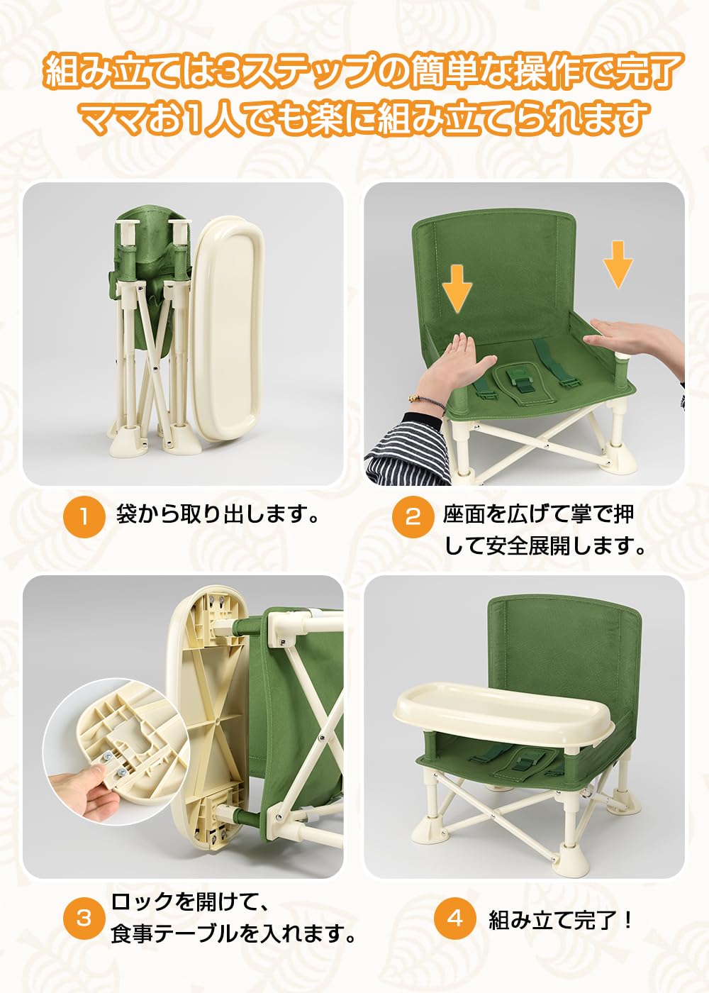 【折りたたみ式&組み立て簡単】折りたたんで収納袋に入れて外出時に持ち運びに便利です。わずか1kgの重量は持ち運びやすい。組み立ては3ステップの簡単な操作で完了、ママお1人でも楽に組み立てられます。コンパクト&軽量設計で持ち運びも収納も楽ちんお家ではもちろん、外での食事にも使えます。母親は、レストランやカフェ、マザーパーティー、公園でのピクニックなどで外食するためにそれらを連れて行くことができます。背もたれの裏に大きなメッシュポケット付き、よだれかけ、ベビー用品、おしりふきなどの便利な収納スペースを提供します!