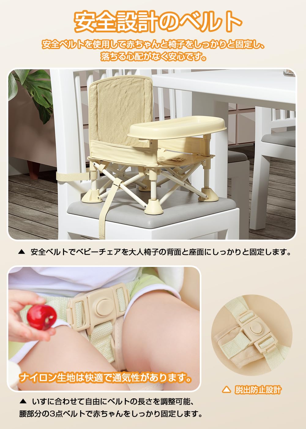【安全設計のベルト】安全ベルトを使用して赤ちゃんと椅子をしっかりと固定し、落ちる心配がなく安心です。いすに合わせて自由にベルトの長さを調整可能、腰部分の3点ベルトで赤ちゃんをしっかり固定します。安全を最優先に考えたY字安全ベルト構造です。クロスベルトを広げて安全性を確保するだけでなく、赤ちゃんの快適さを確保し、ナイロン生地は快適で通気性があります。