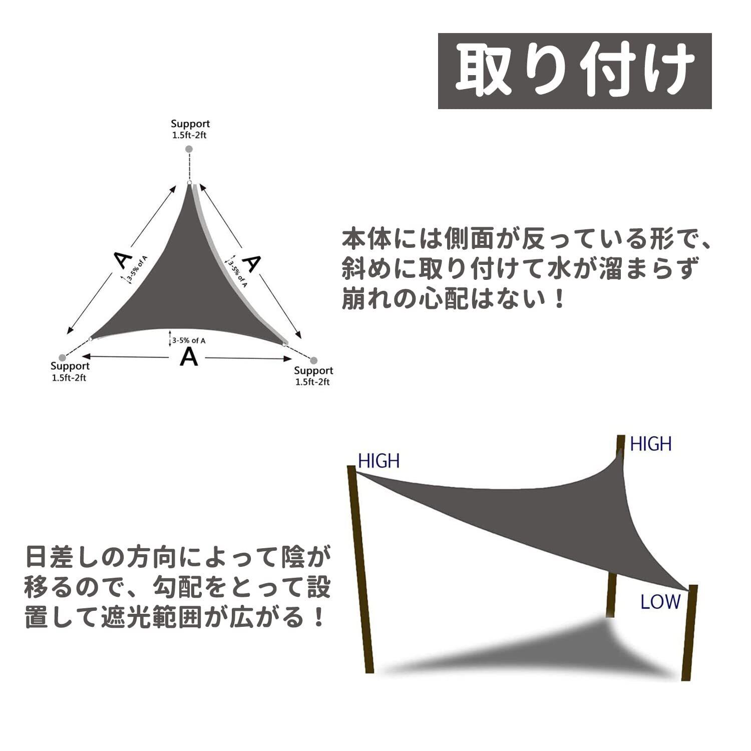 【取り付け簡単】一人でも手軽に設置できる、インストールと取り外しが簡単。本体には側面が反っている形で、斜めに取り付けて水が溜まらず崩れの心配はない!日差しの方向によって陰が移るので、 勾配をとって設置して遮光範囲が広がる!【様々な場所に適用】庭、ガーデン、パティオなどで、家族や友人に涼しい色合いを提供します、キャンプピクニックなど、屋外で過ごすときに太陽から身を守るのに最適です。