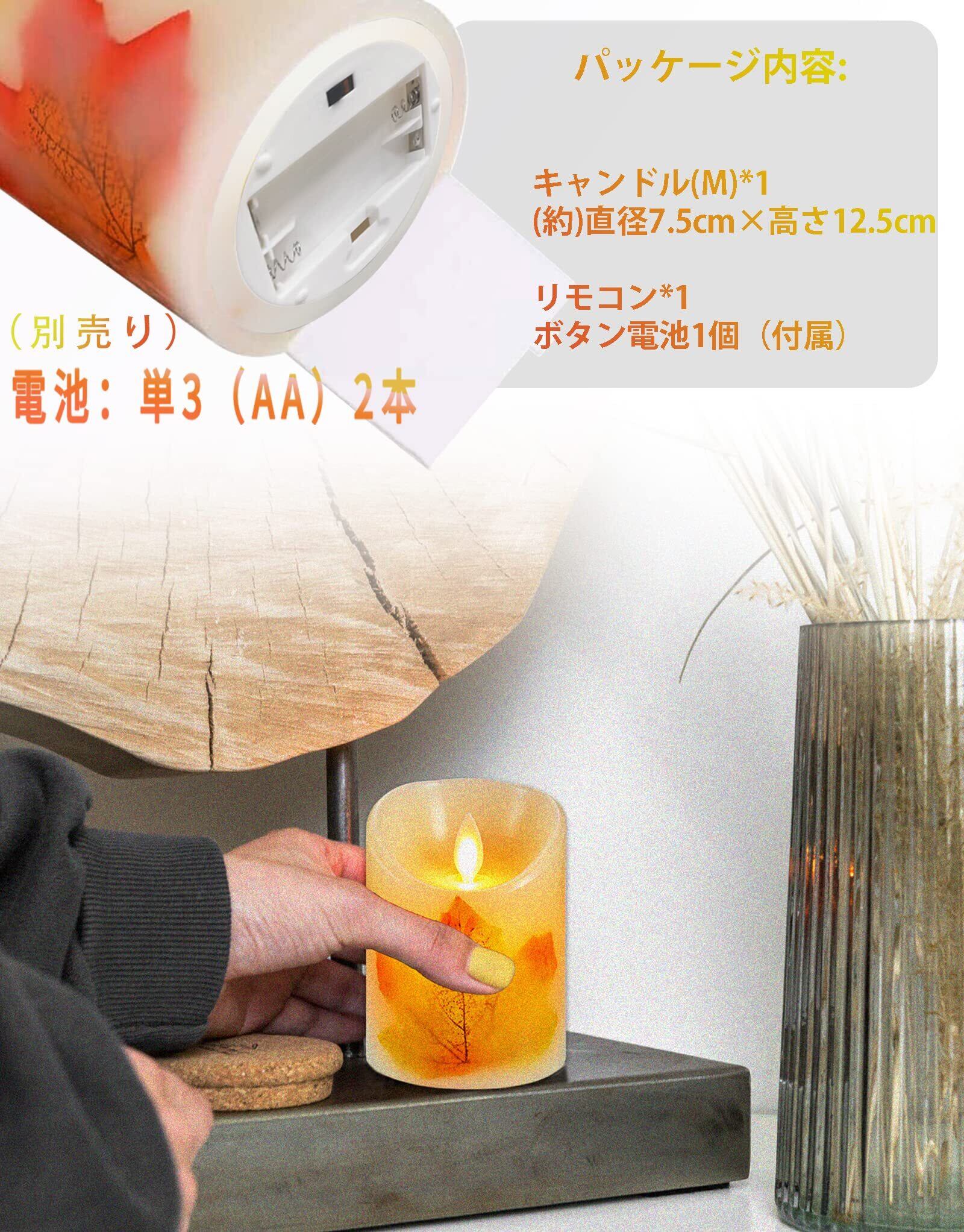 【セット内容】:LEDキャンドル×1本 サイズ:M(直径7.5cm×高さ12.5cm)単3電池(別売り)、リモコン*1、リモコン用電池:ボタン電池1個(付属)、 取扱い説明書*1 【注意事項】LEDランプの寿命は50,000時間以上です。次のようなヒントにもっと注意を払う限り、それは再利用可能です。 ※このろうそくは本物のワックスで作られており、可燃性です。このろうそくに火をつけようとしないでください。 ※直射日光を避け、熱源から遠ざけ、極端な温度にしないでください。ろうそくが柔らかくなったり溶けたりすることがあります。※防水性がないため、水のかかる恐れがある場所では、ご利用にならないでください。