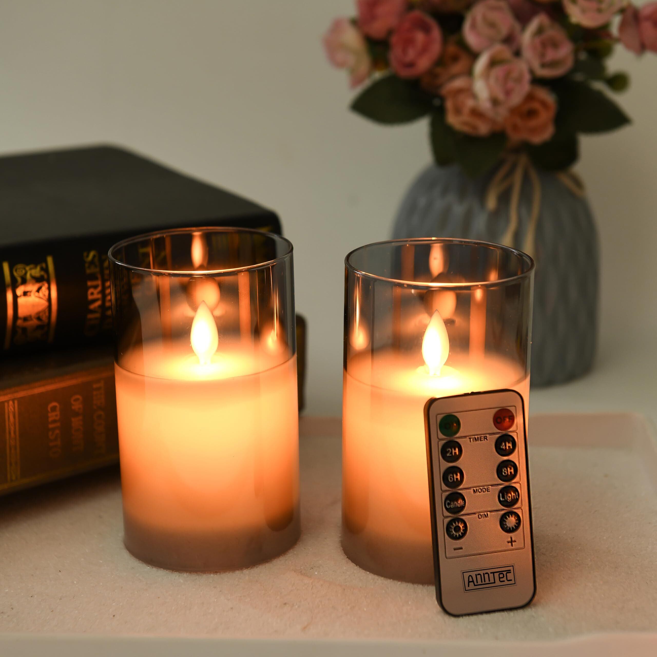 【2点セット】AnnTec LEDキャンドルライト ロウソク 本物の炎のようにゆらめく 暖色光 火を使わない ゆらゆら揺れる 安全 省エネ 専用リモコン付き 明るさ調整 LEDキャンドル LEDロウソク 電池式 ガラス (直径7.5cm×高さ12.5cm) (グレー)