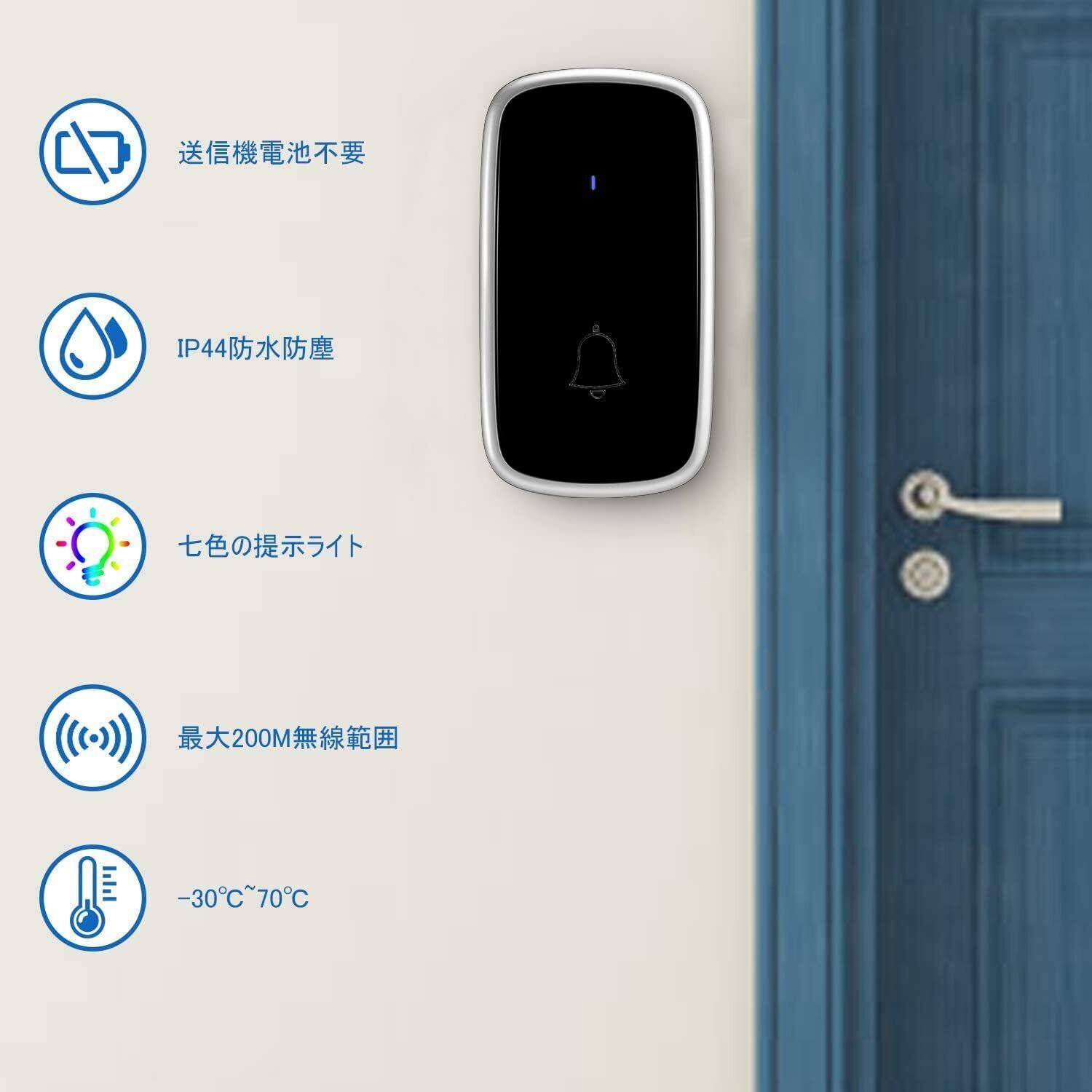 ワイヤレスチャイム 玄関ドアベル 自動発電 音と光で呼び出し 7色提示led 電池不要 防水防塵 4段階音量調節 介護 飲食店/玄関/浴室などに適用 200M無線範囲 送信機1 受信機2