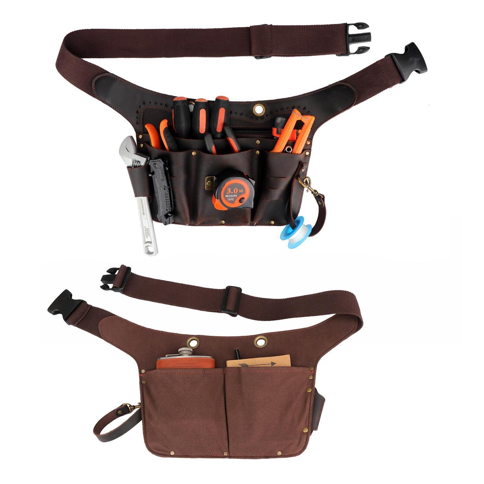 【腰袋】サイズの異なる複数のポケットがあり、さまざまなツールをうまく収納できます。工具やネジ、ハサミ、カッターなどの資材を腰に下げておくための収納袋です。携帯電話用のジッパー付きコンパートメントが1つ付いています。
