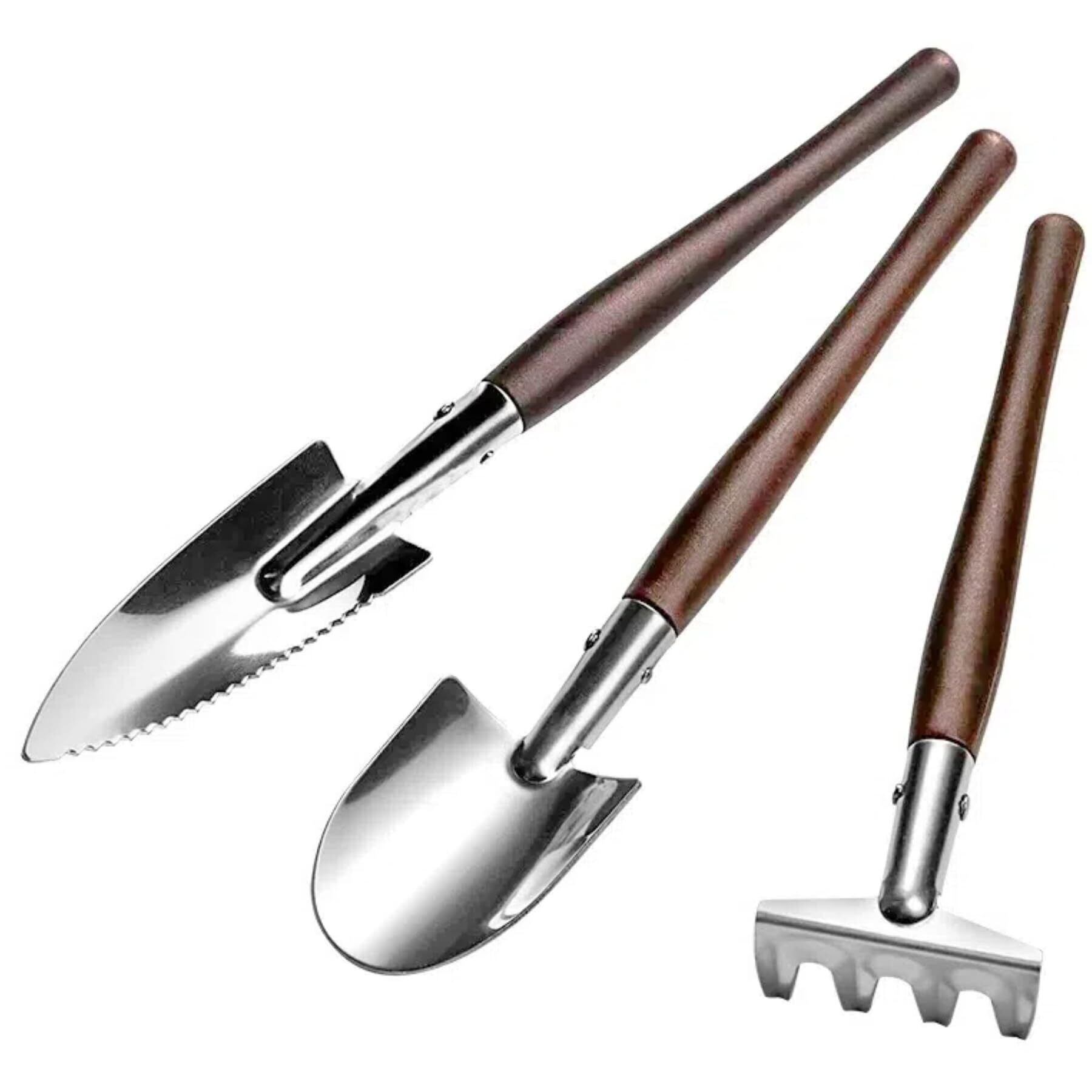 【多機能な使い方】丸形の小型スコップは培土、土の詰め替え、施肥に最適です。鋸歯状エッジある尖頭ショベルは深さ測定・移植・植物の茎元の切断に適しています。小型熊手は土ほぐし、除草、植え付け作業に使えます。多肉植物や小鉢植えの様々な作業に対応できます。