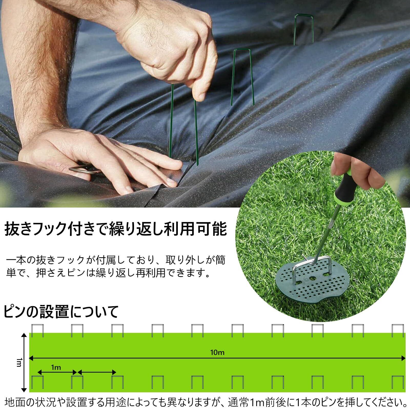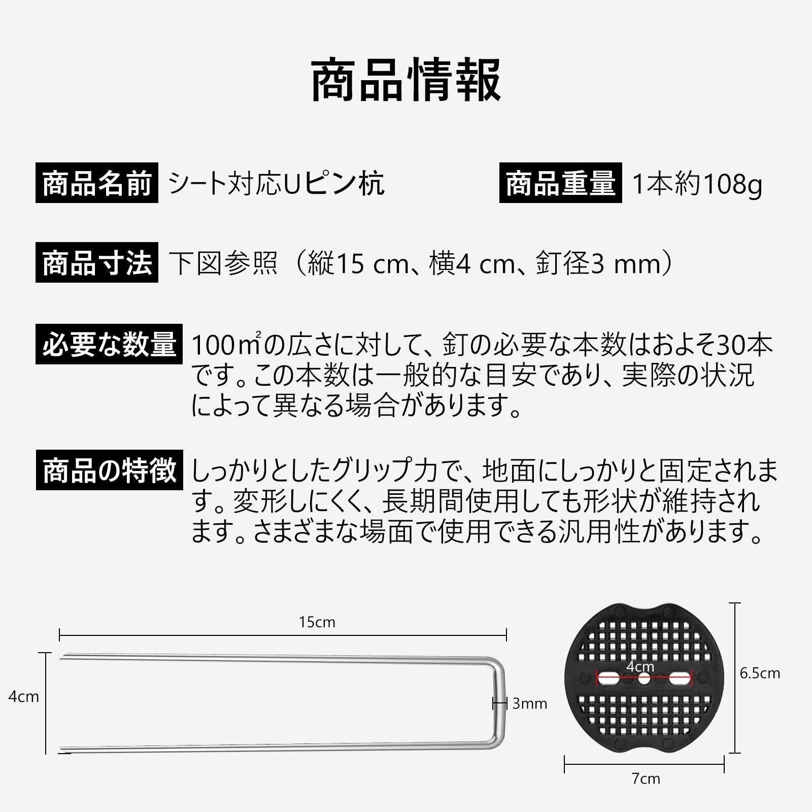 幅広い使用シーンに対応:U字型ピンは人工芝や防草シート、農業用マルチ、防虫ネットの固定に適しています。さらに、キャンプでのテント固定ピンとしてもおすすめで、様々な園芸・農業・アウトドア用品を頑丈に支えます。