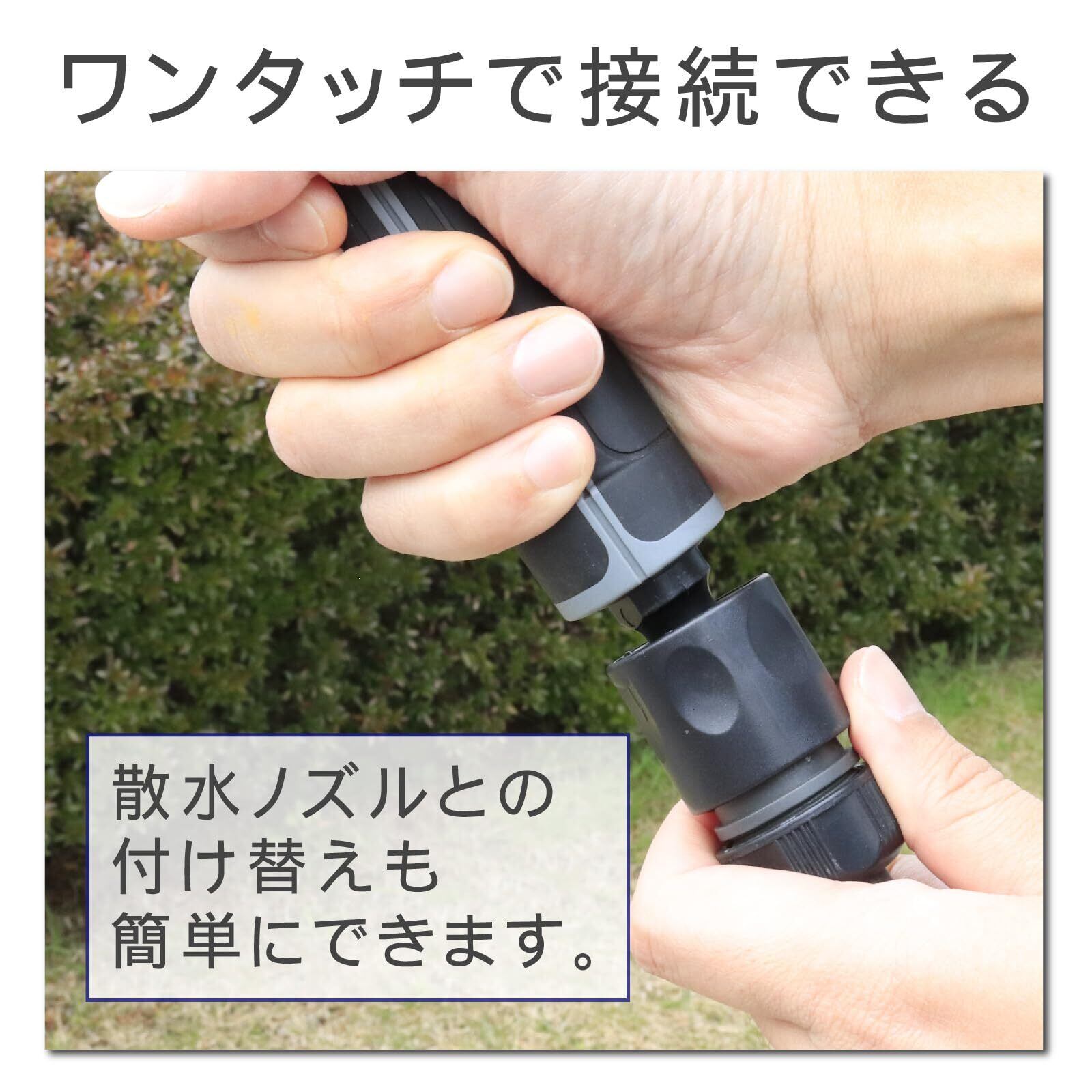 【お手持ちのホースリールに簡単接続】付属のカップリングにホースを接続するだけで簡単にご使用いただけます。製の散水ノズルをお持ちの方は、ノズルの先をカチッと取り外し、ワンタッチで交換いただけます。