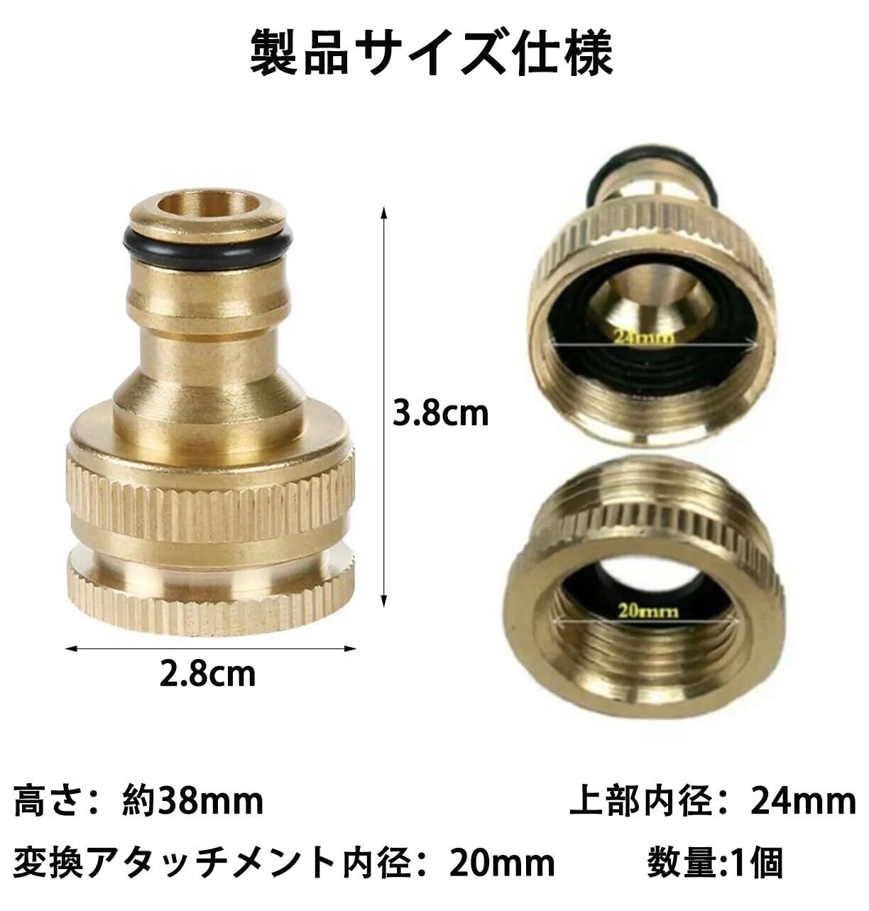 【寸法】 蛇口 ホース 接続高さ約38mmで、上部内径は24mm、変換アタッチメント内径は20mmです。