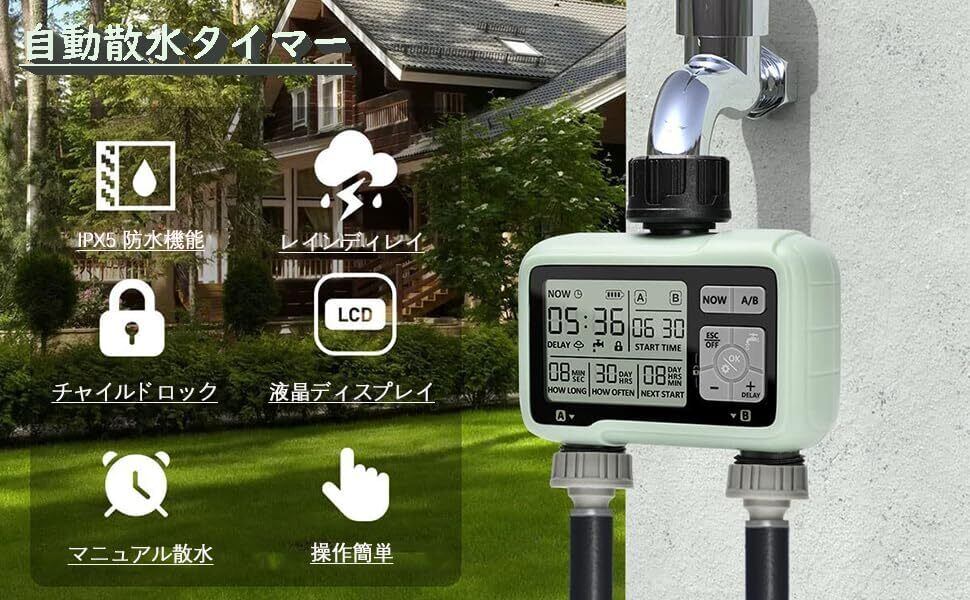 シバ屋 自動散水タイマー 散水ホース 2アウトレット 植物灌水 灌漑システム 給水 観葉植物 室内 鉢植え給水 鉢植え 自動灌漑/子供ロック/大雨遅延/手動灌漑 (グリーン)