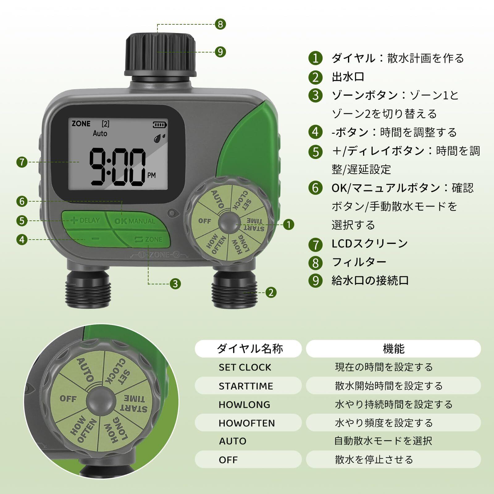 【簡単な設定と使用方法】散水タイマーのノブを回し、選択ボタンを押すことで、水やりの開始時間、持続時間、頻度を簡単に設定することができます。設定の後、灌漑システムは完全に自動化され、設定したスケジュールに従って稼働します。ほとんどの情報は大画面のLCDスクリーンに表示され、読みやすいです。自動散水機は単3電池2本(別売り)で電力供給ができます。電池残量の表示が低電力の場合は、電池を交換してください。