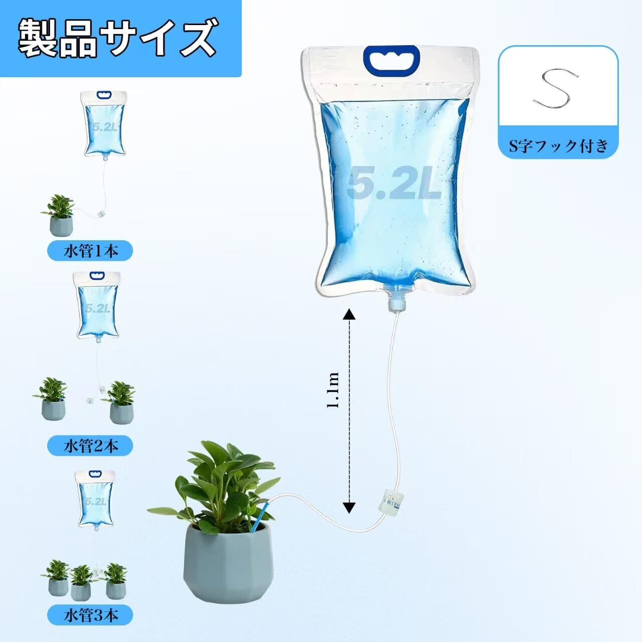 【1個セット】Sediven 自動水やり機 水やり当番 自動給水器 給水キャップ 水量調節可能 点滴灌漑水やり 自動 出張 留守 旅行中 植物 植木鉢 盆栽 観葉植物 大容量 5.2Lサイズ S字フック付き (水管×2本)