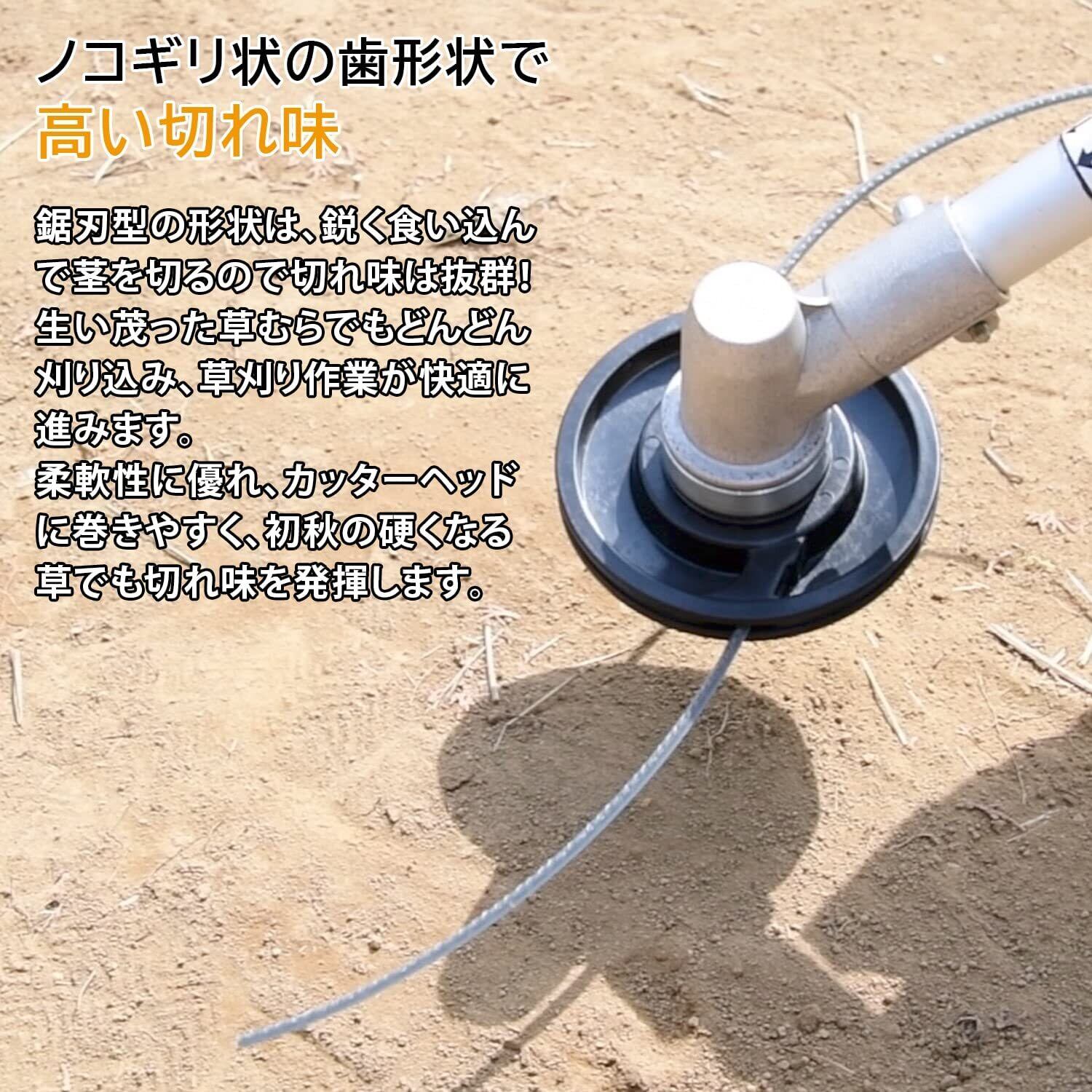 【特徴】切れ味抜群な草刈用ナイロンコードです。ナイロン材料・コード成型・せん断加工などすべて日本国内で行っております。キックバックが起きにくいナイロンコードは安全性が高く、さらに草を粉砕しながら刈り取りを行うので、草刈作業後の草を集める作業を必要としません。刈り取った場所に草が溜まらなければ、刈り具合も確認できるので刈残しも少なく済みます。柔軟性に優れて、カッターヘッドへの巻き作業も簡単です。のこぎり状の刃形状は切れ味抜群で、初秋の硬くなりやすい草でも高い切れ味を発揮します。
