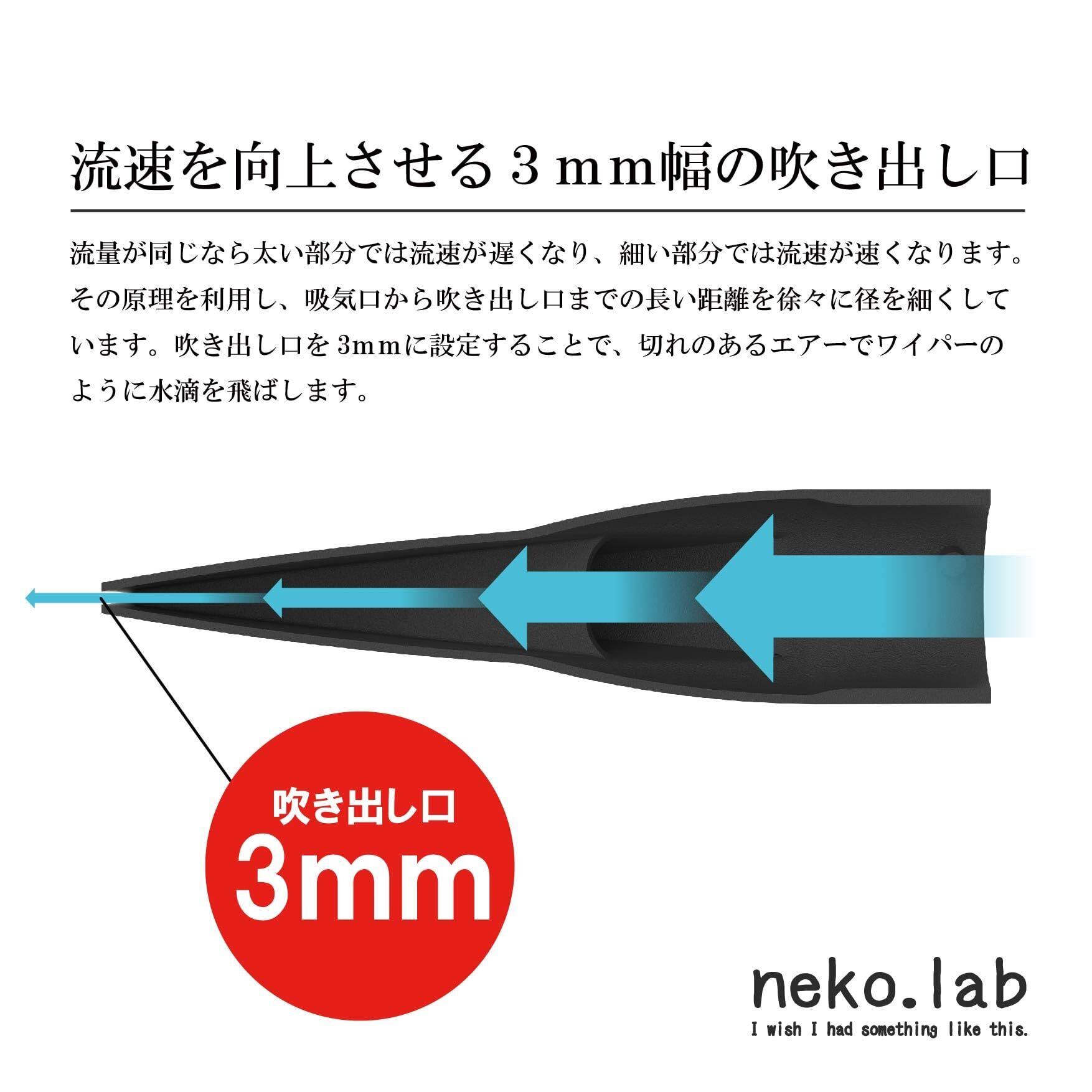 風をワイドに広げ、水滴をワイパーのように効率的に飛ばします。吹き出し口を3mmに設定し、鋭いエアーで水滴を飛ばします。
