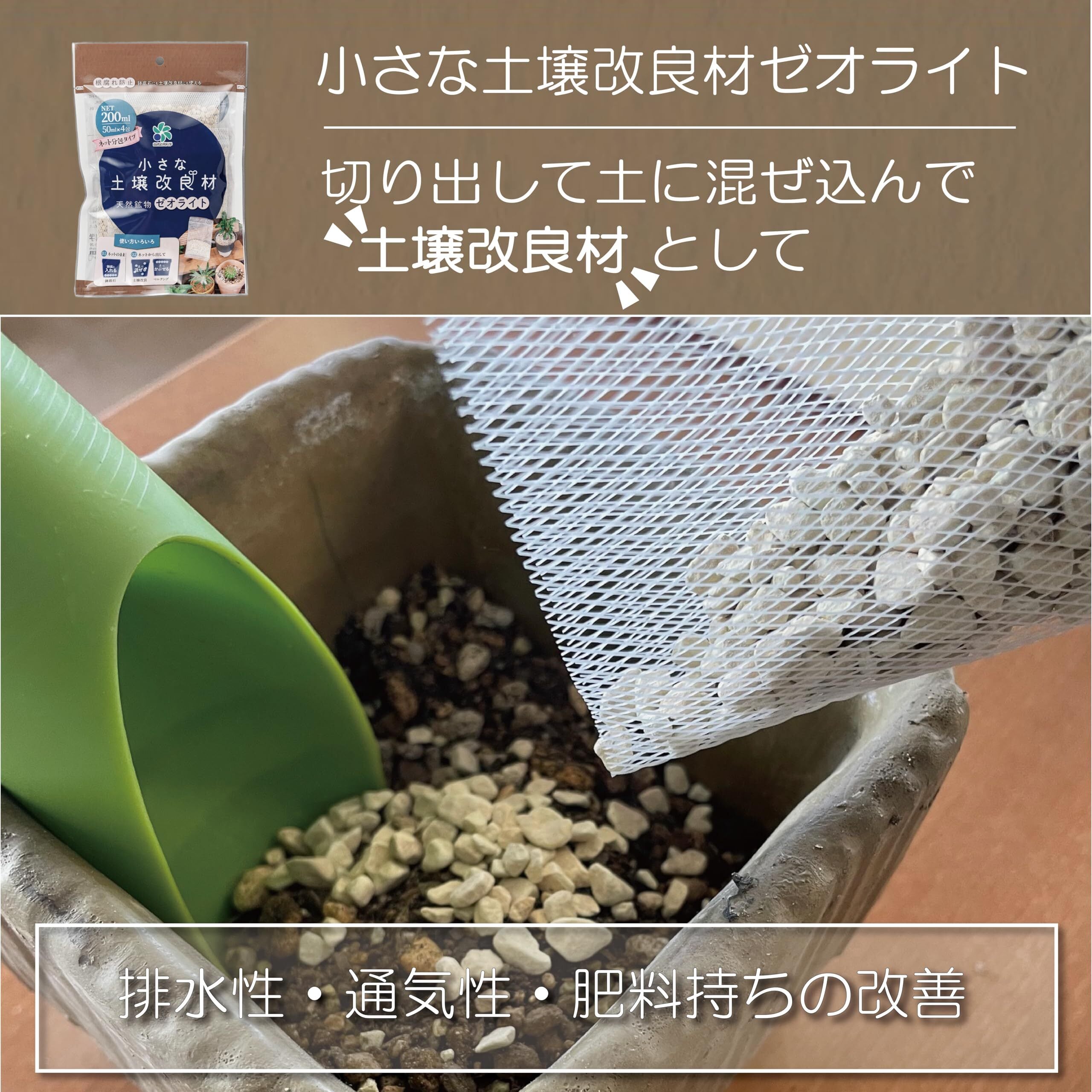 ●日本産のゼオライトを選別し、ネット(50ml)に入れた新発想の鉢底石です。