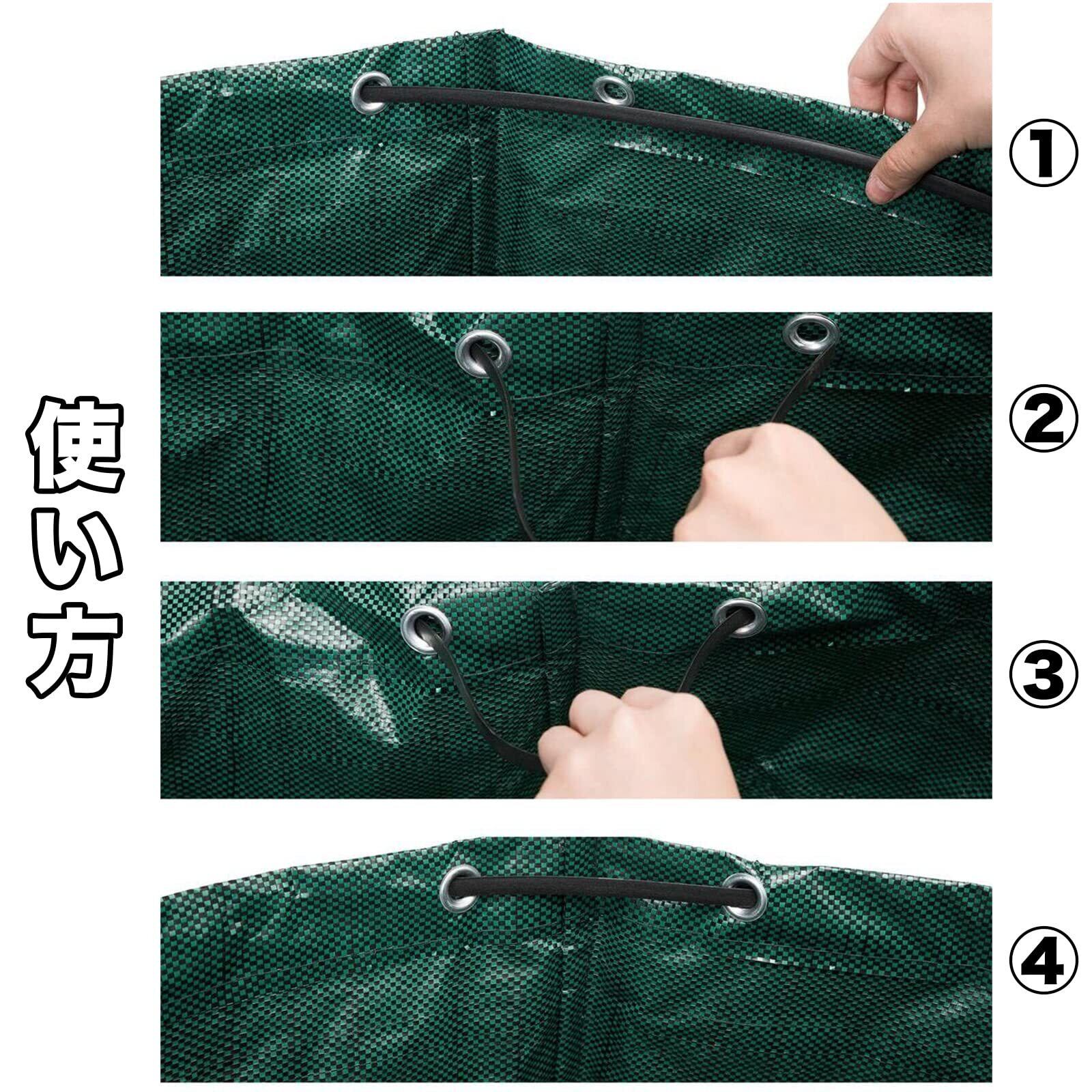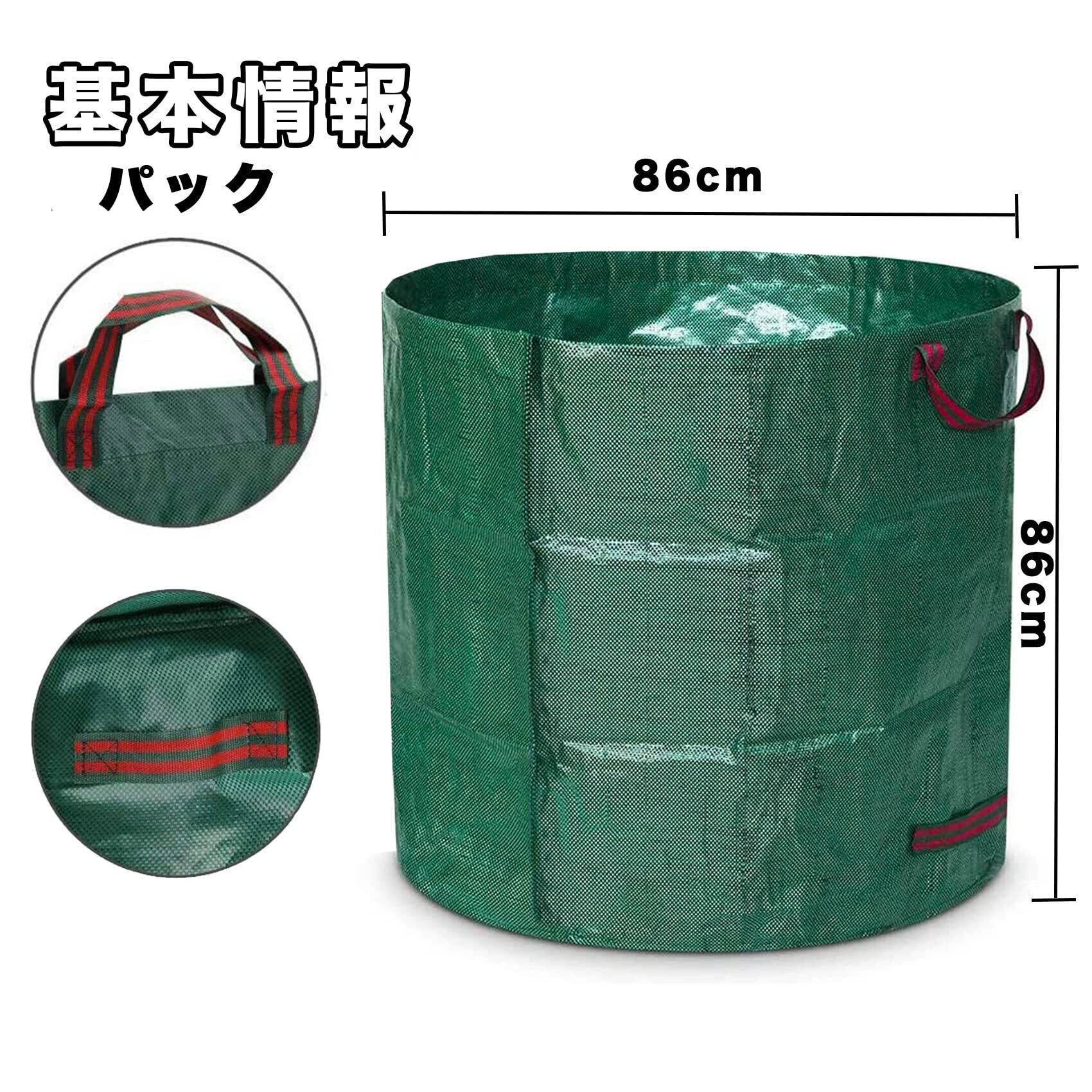 【基本情報】ガーデンバッグのセット - 最大容量(各袋)の500L - 高さ86cm直径86cm - バッグあたり100kgの最大重量。 安定性を高め、袋を開いた状態に保つための柔軟なフープを含めることで、塗りつぶしやすく、空きやすい。素材:ポリプロピレン 色:緑。