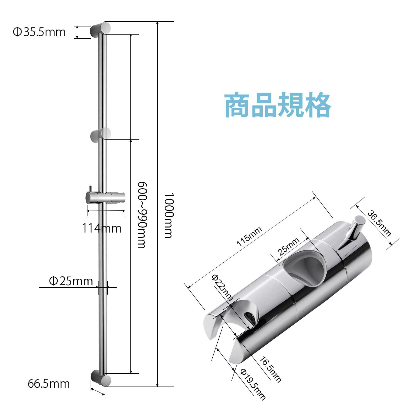 OFFO シャワースライドバー 1000㎜ シャワーバー 600mmから1000mmまで ピッチ穴距離調整可能 スライドバー付シャワーフック シャワ角度調節可能 浴室用 クロムメッキ 全長100cm 日本語取付説明書付