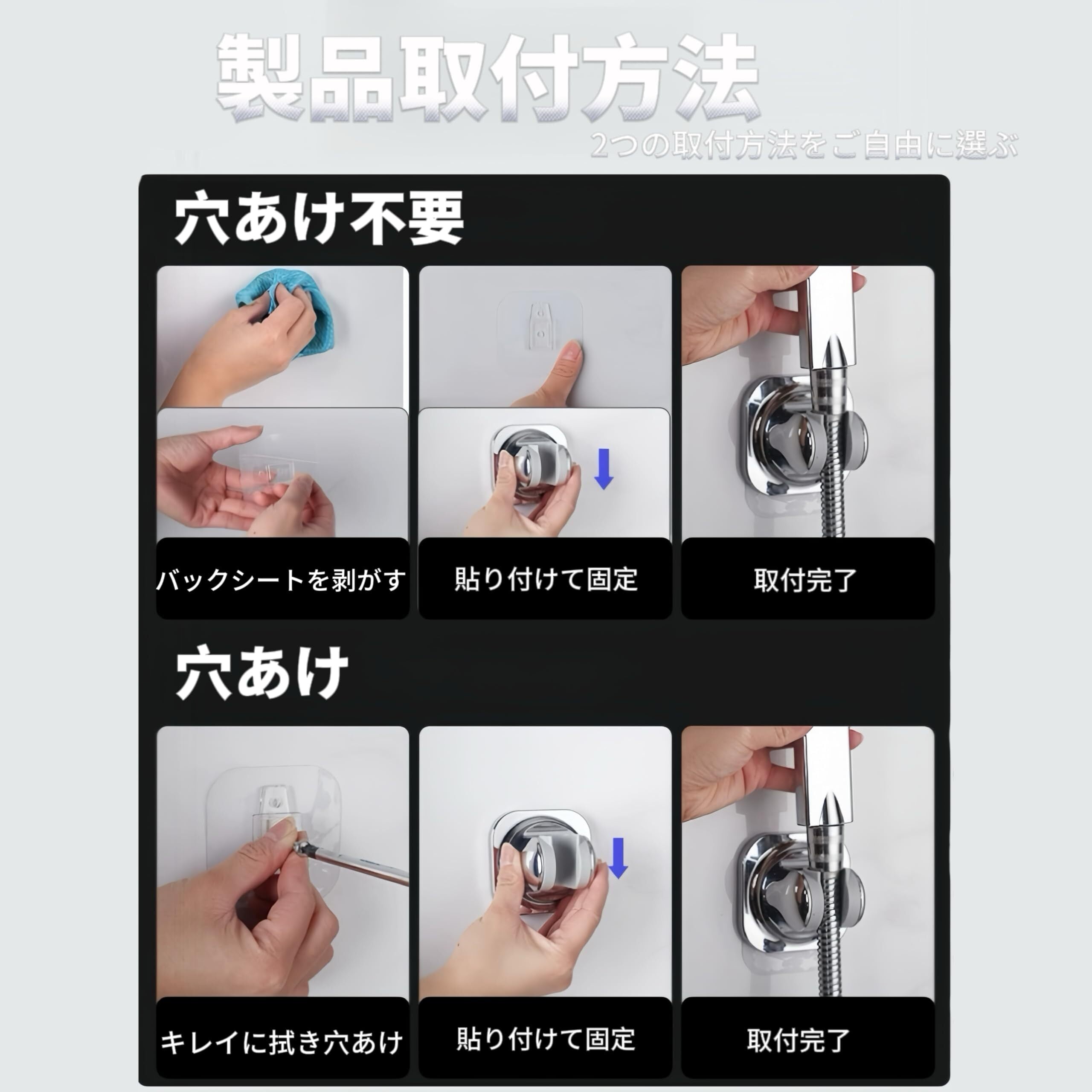 【取付手順】1.取り付ける箇所を抜きます。2.粘着テープをはがして壁に貼り付けります。シャワーフックを取り付けます。