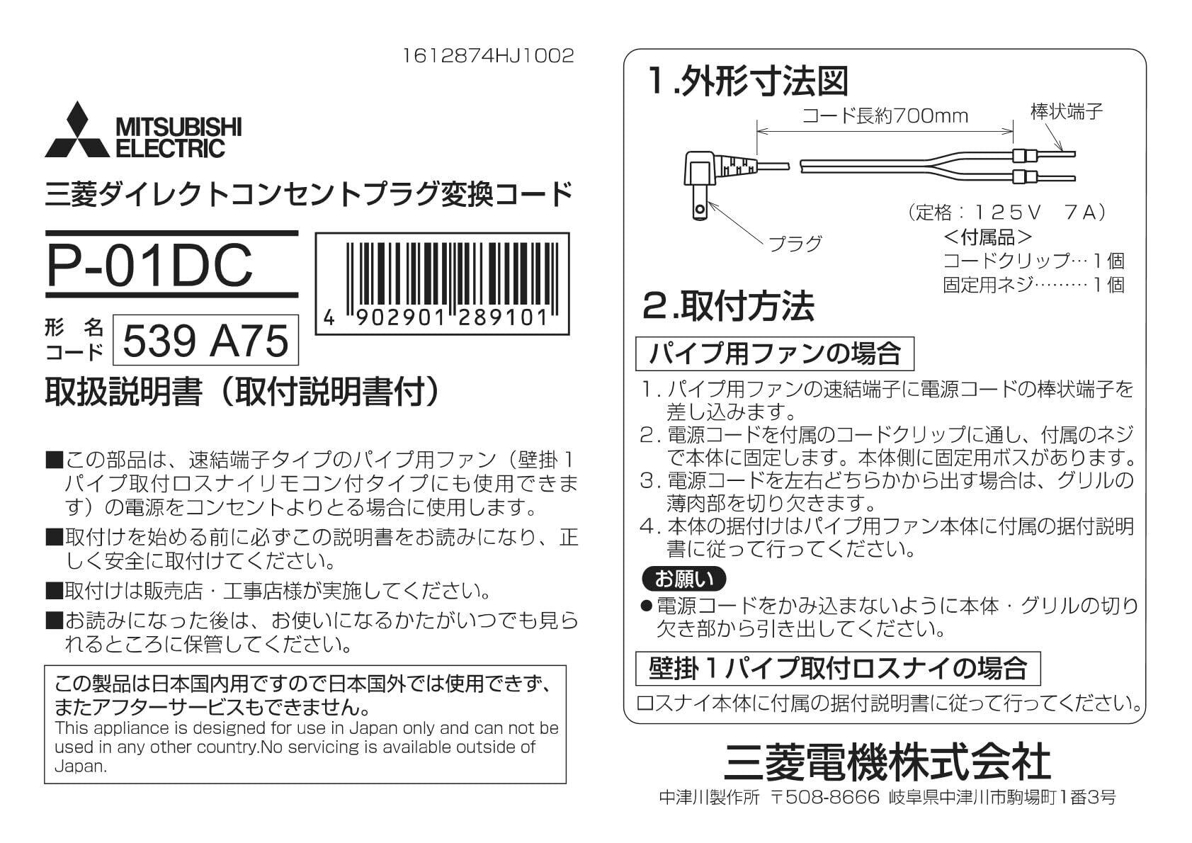 三菱電機 MITSUBISH換気扇・ロスナイ [別売]換気扇用システム部材<他関連部材> その他部材 P-01DC 【P-01DC】