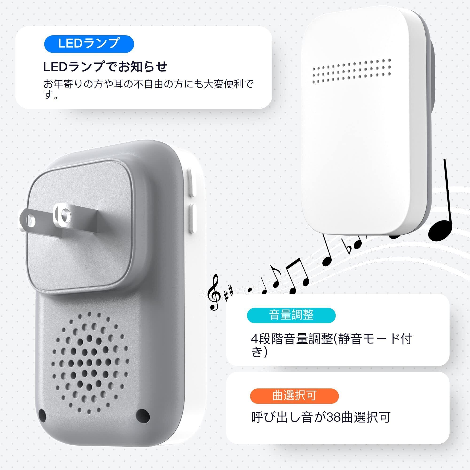 【38曲4段階音量調節と光でお知らせ】このワイヤレスチャイムの送信機を押すと、受信機が音を立てながら両方のライトが点滅してお知らせします。 この玄関チャイムは38種類の音色の曲と0-100DBの4段音量を選ぶことができます。自分の好みや使う場所に合わせて、適切な音量を選ぶことができて、とても便利です。