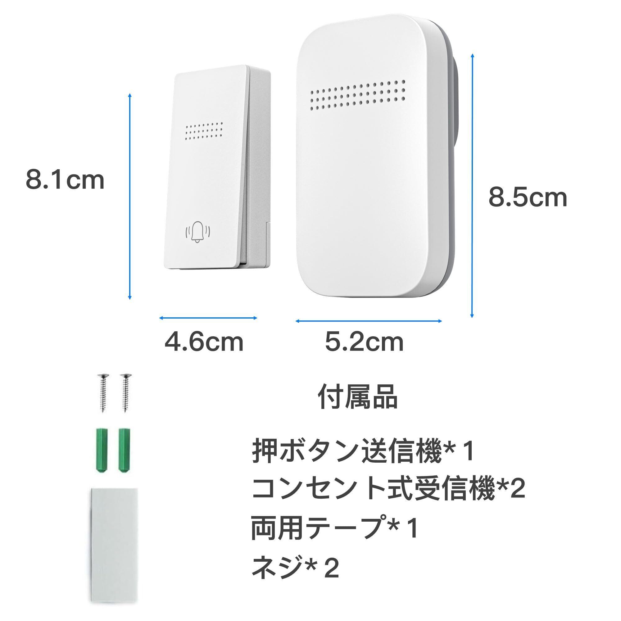 【増設自由&多用途】1つの送信機が複数の受信機に接続可能。1つの受信機も複数の送信機に接続することもできます。送信機と受信機を任意に組み合うことができ、2対2、3対2などが実現可能です。 来客時の玄関チャイム、介護、御店や事務所での連絡や呼び出しに様々な場所にご利用できとして大活躍です。 お年寄り、子ともや体の不自由な方のチャイムとしてもおすすめです。