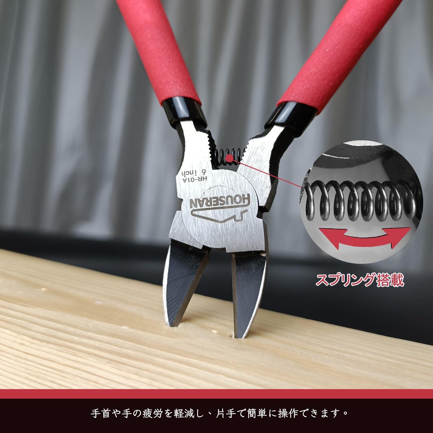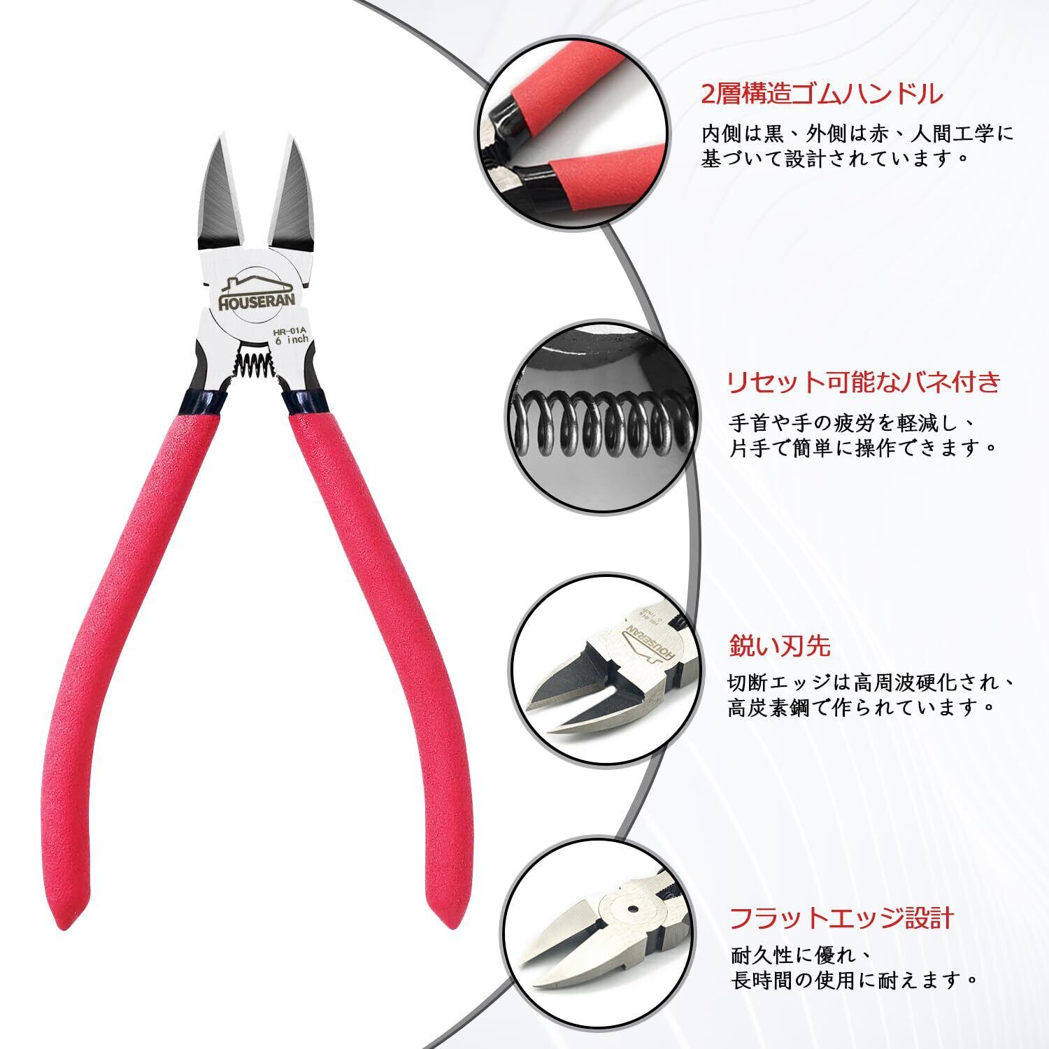 HOUSERAN ニッパー 工具 プラモデルニッパー 電工ニッパー 精密ニッパー 薄刃 強力 プラスチック バネ付き DIY 165mm
