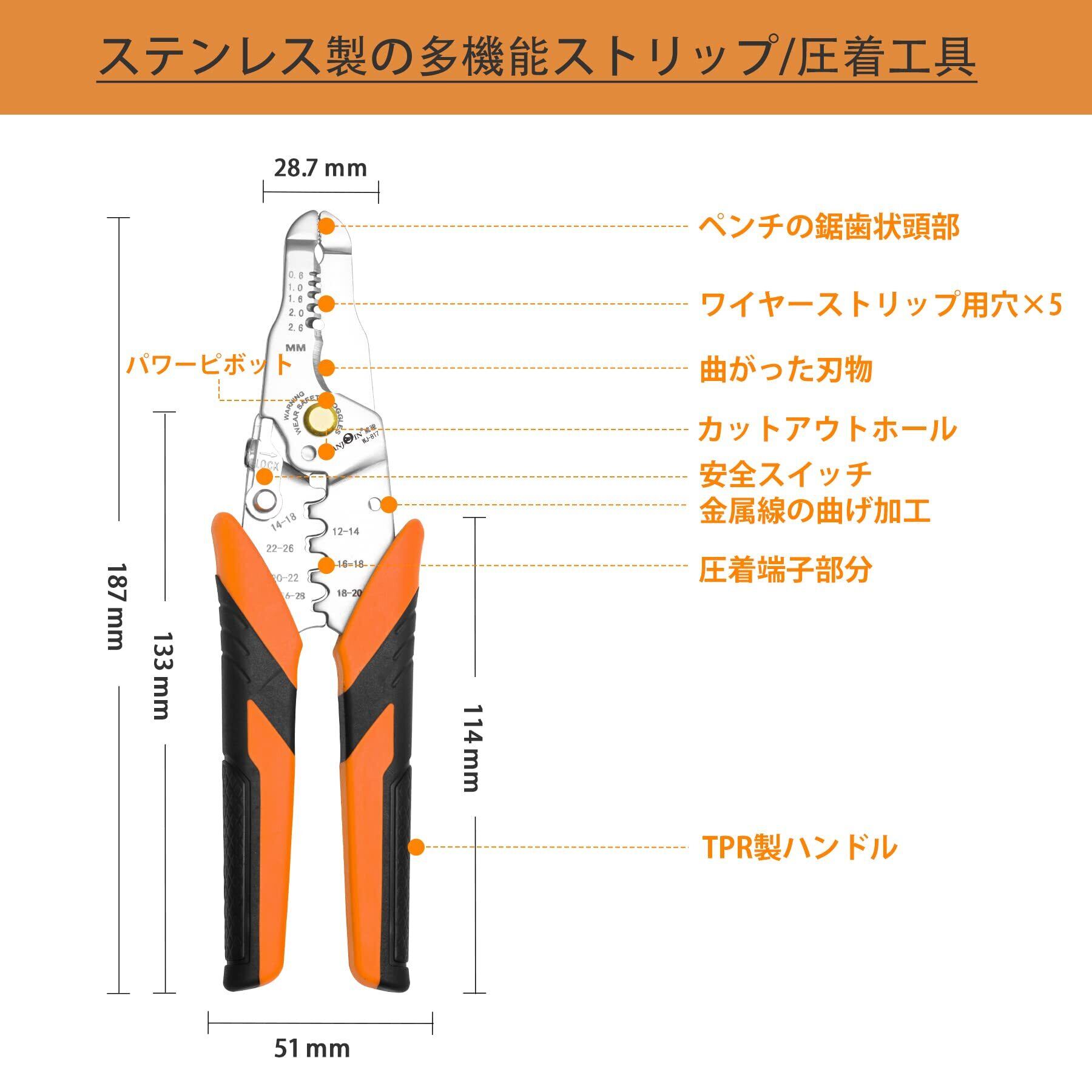 VANJOIN ワイヤーストリッパー/端子圧着ペンチ、多機能ワイヤーストリッパー 電気工事用 電工工具、ステンレス鋼 ストリッパー、ワイヤーストリッパー 工具(187mm)