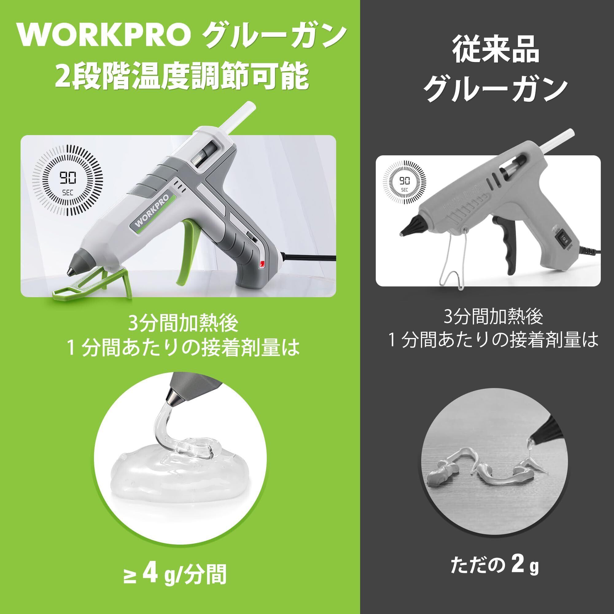 WORKPRO グルーガン ボンドガン 100W スティック10本付 2段階調節 軽量速乾 液漏れ・やけど防止 スタンド付き PTC加熱システム 強力粘着 補修 接着剤 DIY趣味 手芸 木工作業用 PSE認証済