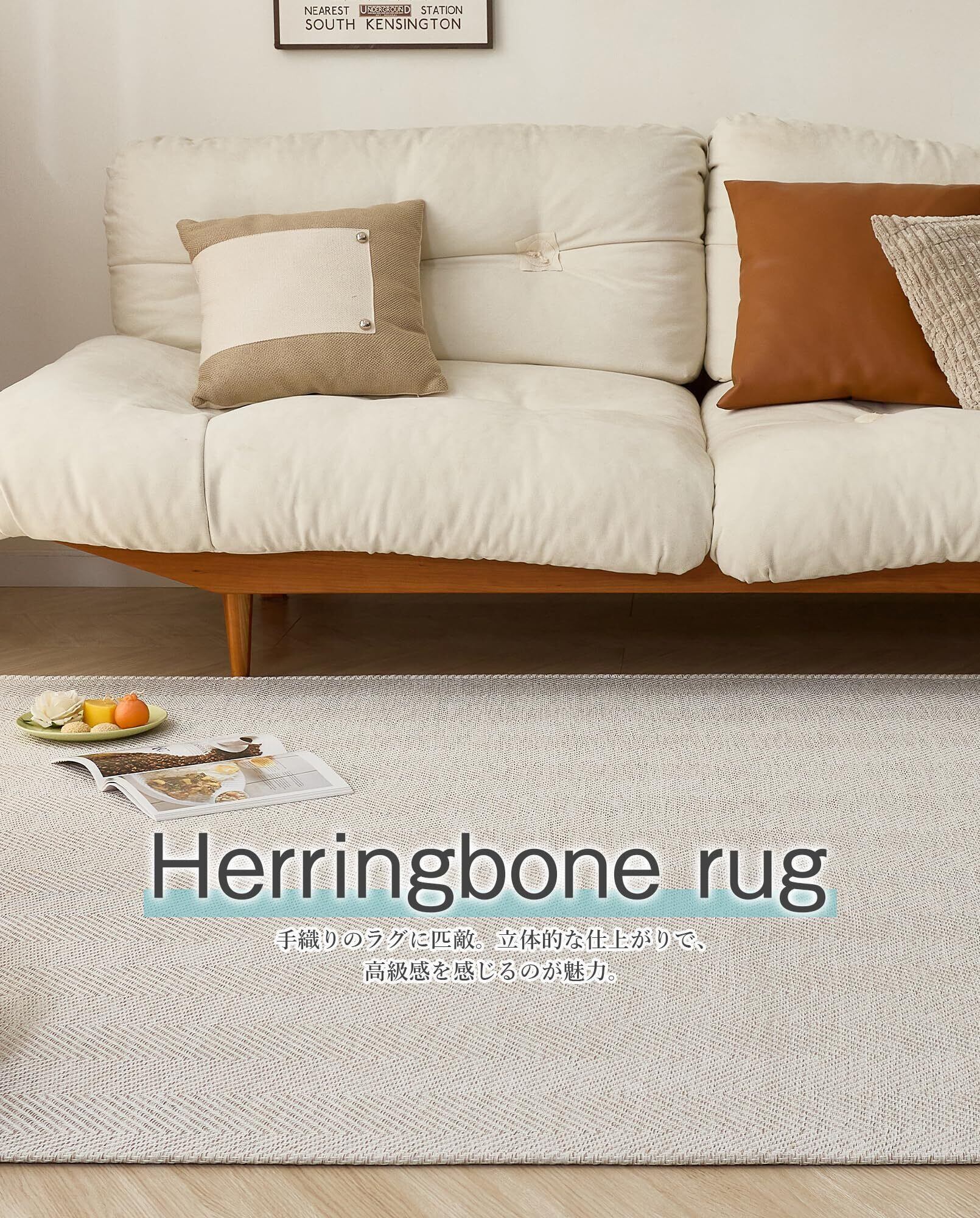 【上品な空間を演出!ヘリンボン柄ラグ】白系と優しい色合いの糸を混ぜて、見た目が開いた魚の骨に似ていることから名付けられた「ヘリンボン」。おしゃれなヘリボーン織りと自然な立体感、高級感を演出。柔らかさと大人の雰囲気を兼ね備えた上品なデザインに仕上げました。