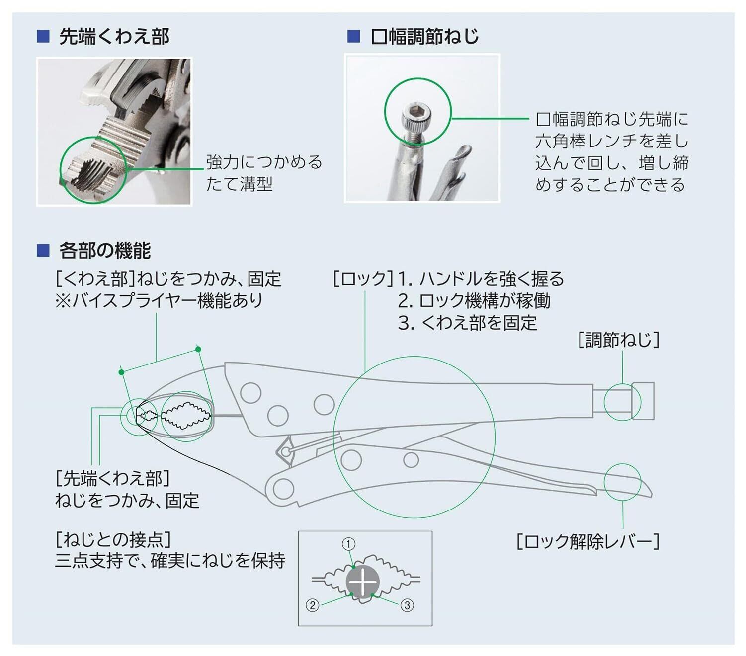 ・口幅調節ねじには六角穴付ボルトを採用しているため、六角棒レンチ(5mm)で増し締めが可能