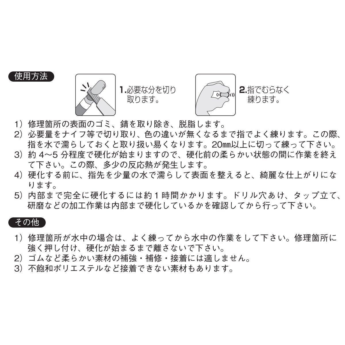 修理個所が水中でも可能!!その場合は、よく練ってから水中での作業を行ってください。修理個所に強く押し付け、硬化が始まるまで離さないでください。