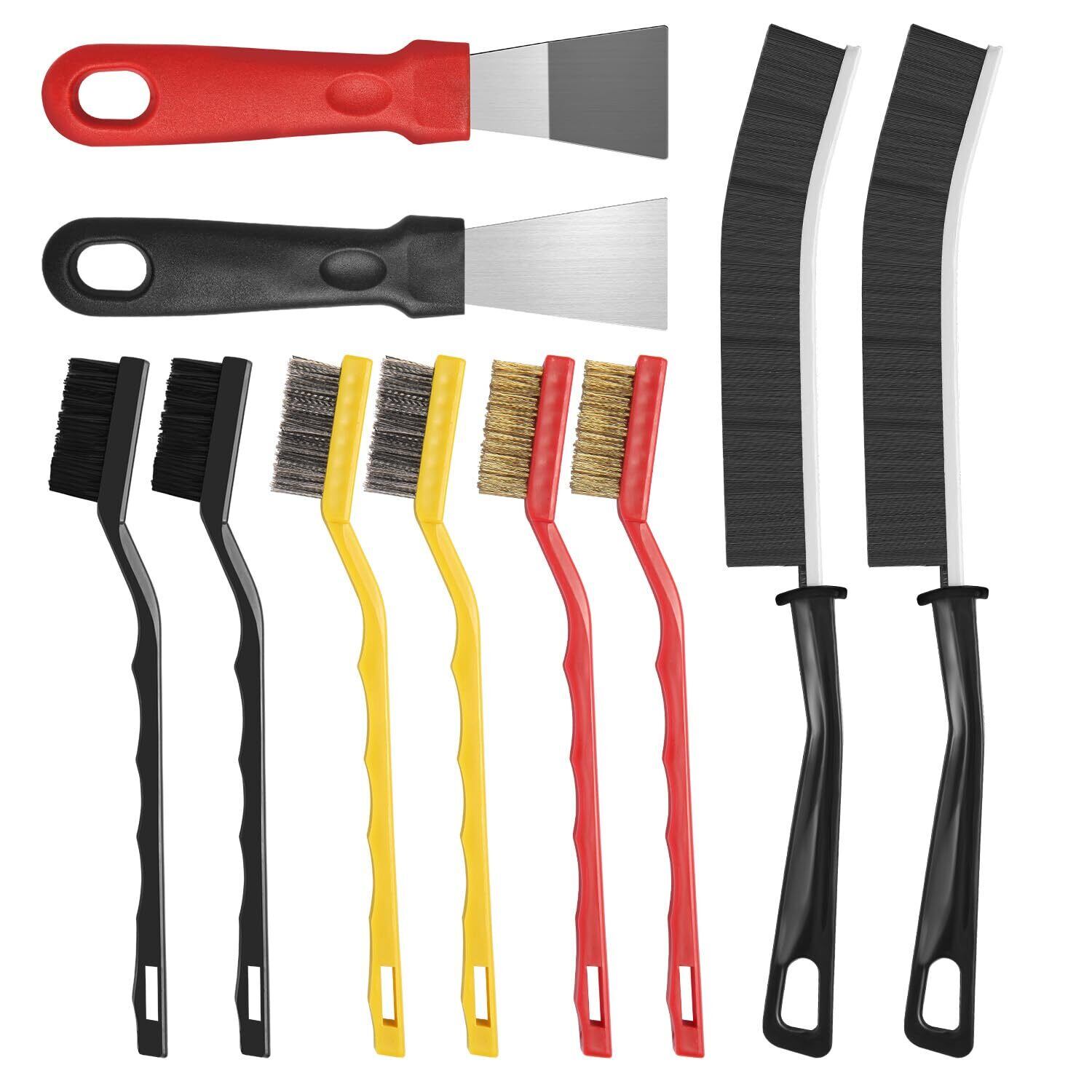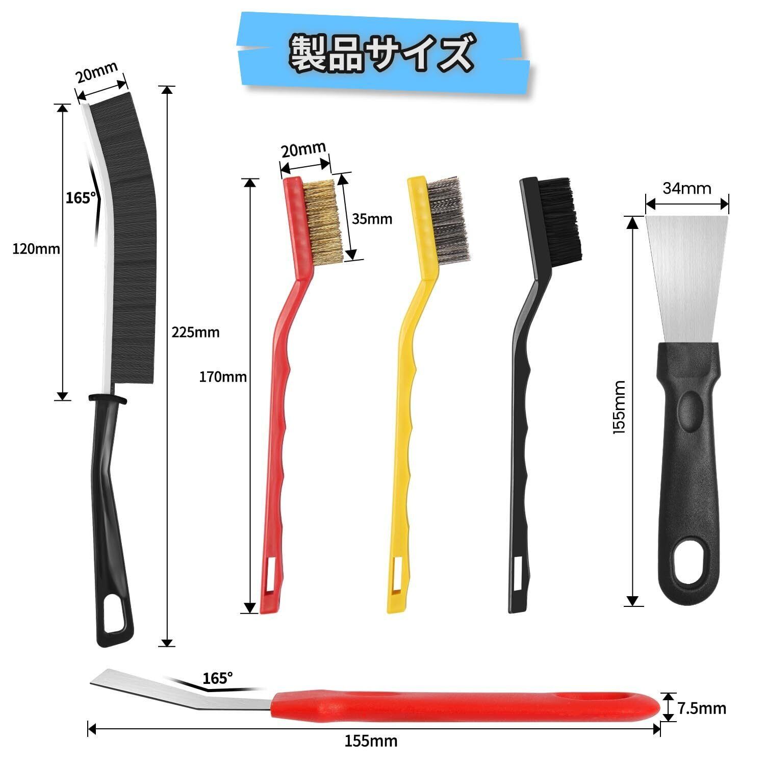 【掃除用ブラシのパッケージ内容】ワイヤーブラシ6本(ステンレス/真鍮/ナイロン各2本)、隙間掃除ブラシ2本、スクレーパー キッチン2本、台所掃除にちょうどいいサイズです、使った後の片付けまでしやすい