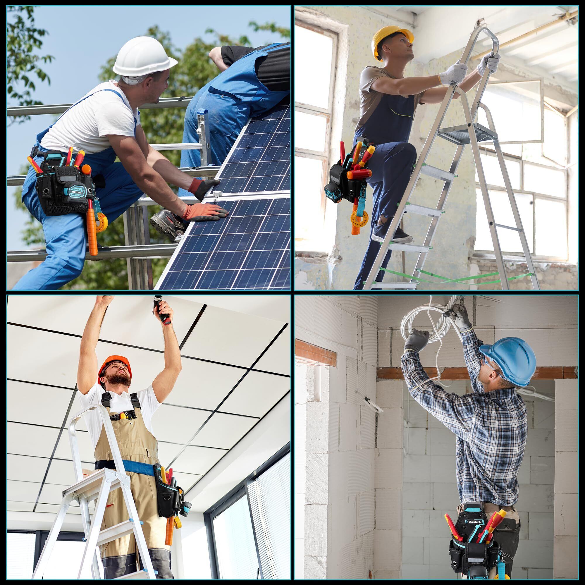 【適用範囲】電工、大工、木工、内装工事、配管配線、建築関連現場など、様々な場面で活躍することができます。電動ドリル、ハンマー、メジャーなどの工具をまとめて収納し、紛失防止にもなります。