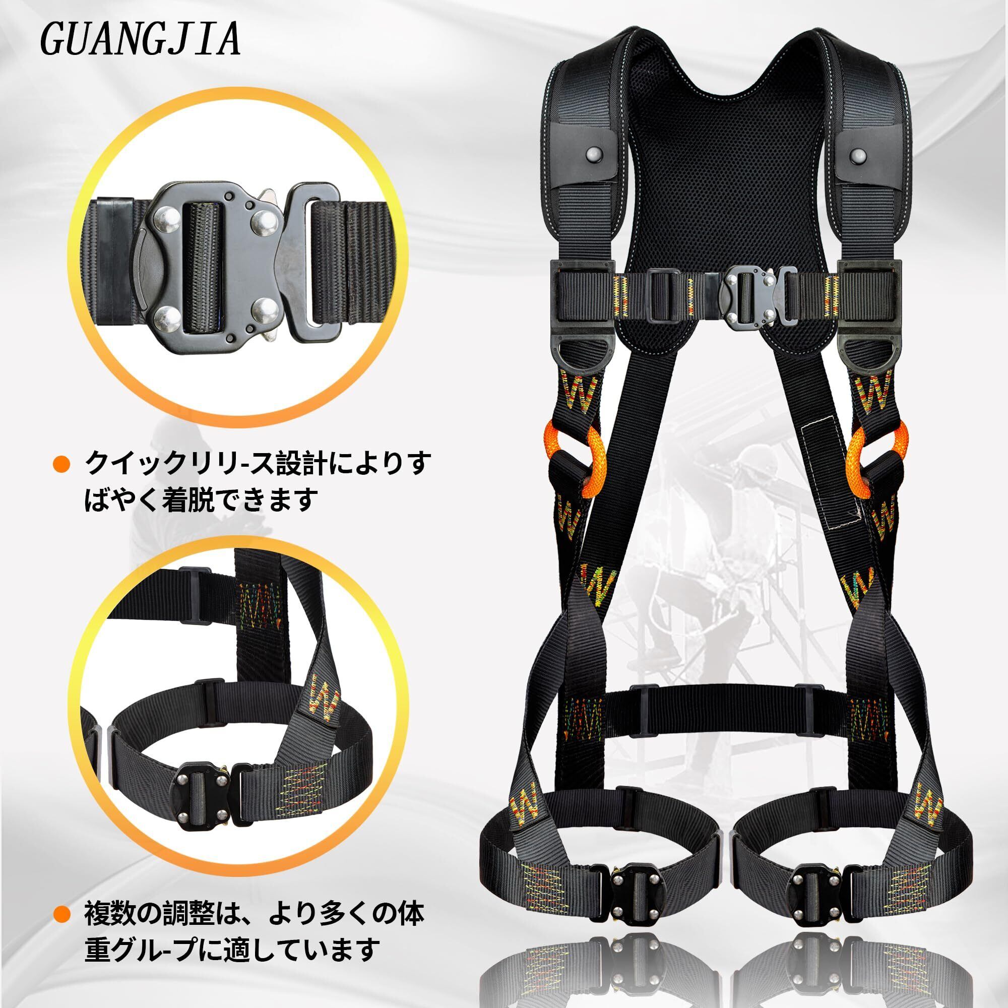 【GUANGJIA調整可能なフルハーネス 新規格】:複数の調整は、より多くの体重グループに適しています高所での作業を容易にするためには、適切なフィットが重要です。当社のハーネス安全帯は、ユーザーが重量内で適切にフィットするように 6 点の調整を提供します。ショックアブソーバーはついていますので、一旦落下時墜落時、ハーネスは衝撃を体全体に分散し、人体への負担を軽減します。フルハーネス安全帯 新規格 セットは、安全で快適、着やすく、あらゆる体格の方に適しています。ハーネスが適切にフィットするように、すべてのバックルが接続されていること、レッグ ストラップとショルダー ストラップがぴったりと合っていること、チェスト ストラップが胸部の中央にあることを確認してください。