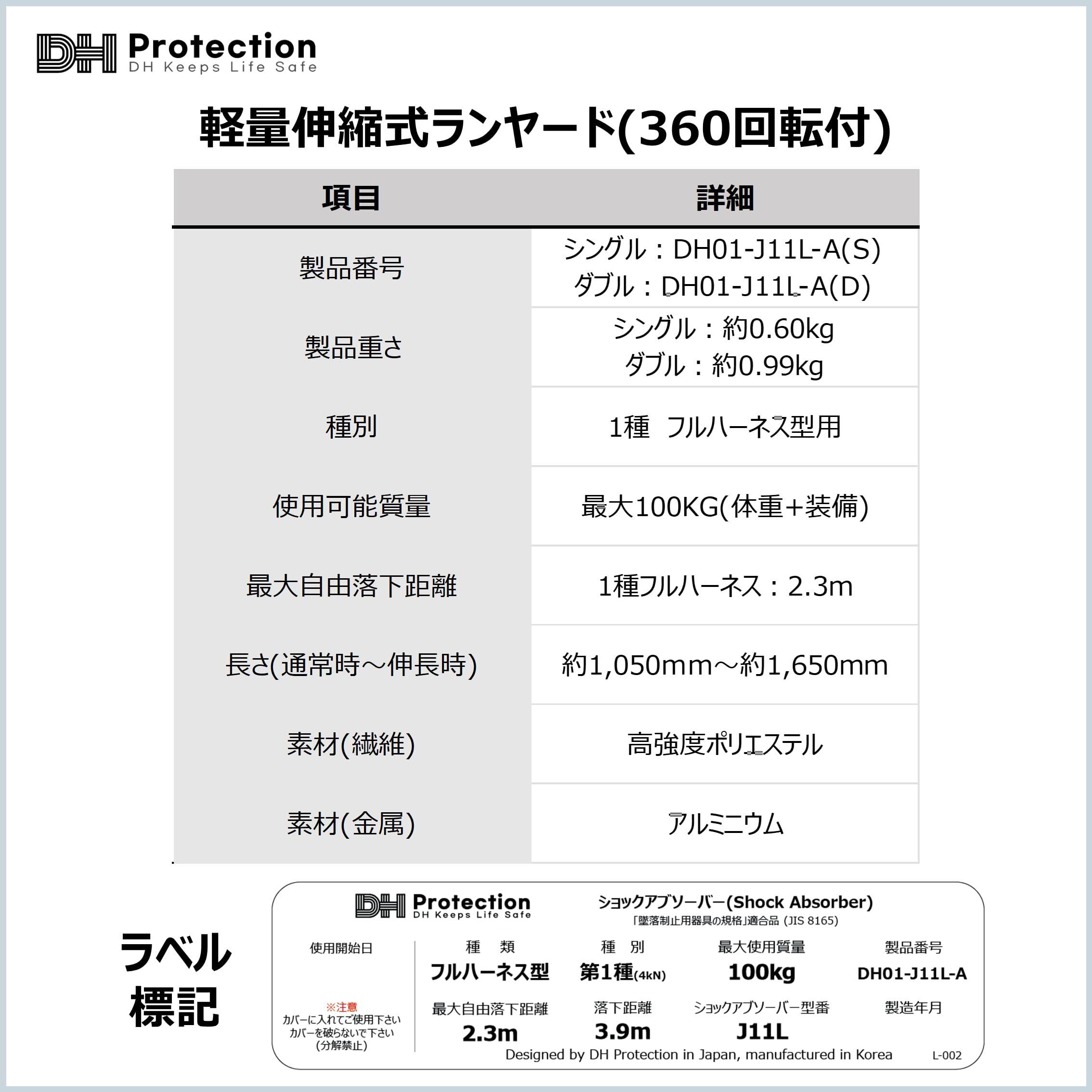 [DH PROTECTION] 【新規格】 軽量 ランヤード 1種 100㎏以下 フルハーネス ランヤード 墜落制止用器具 安全帯