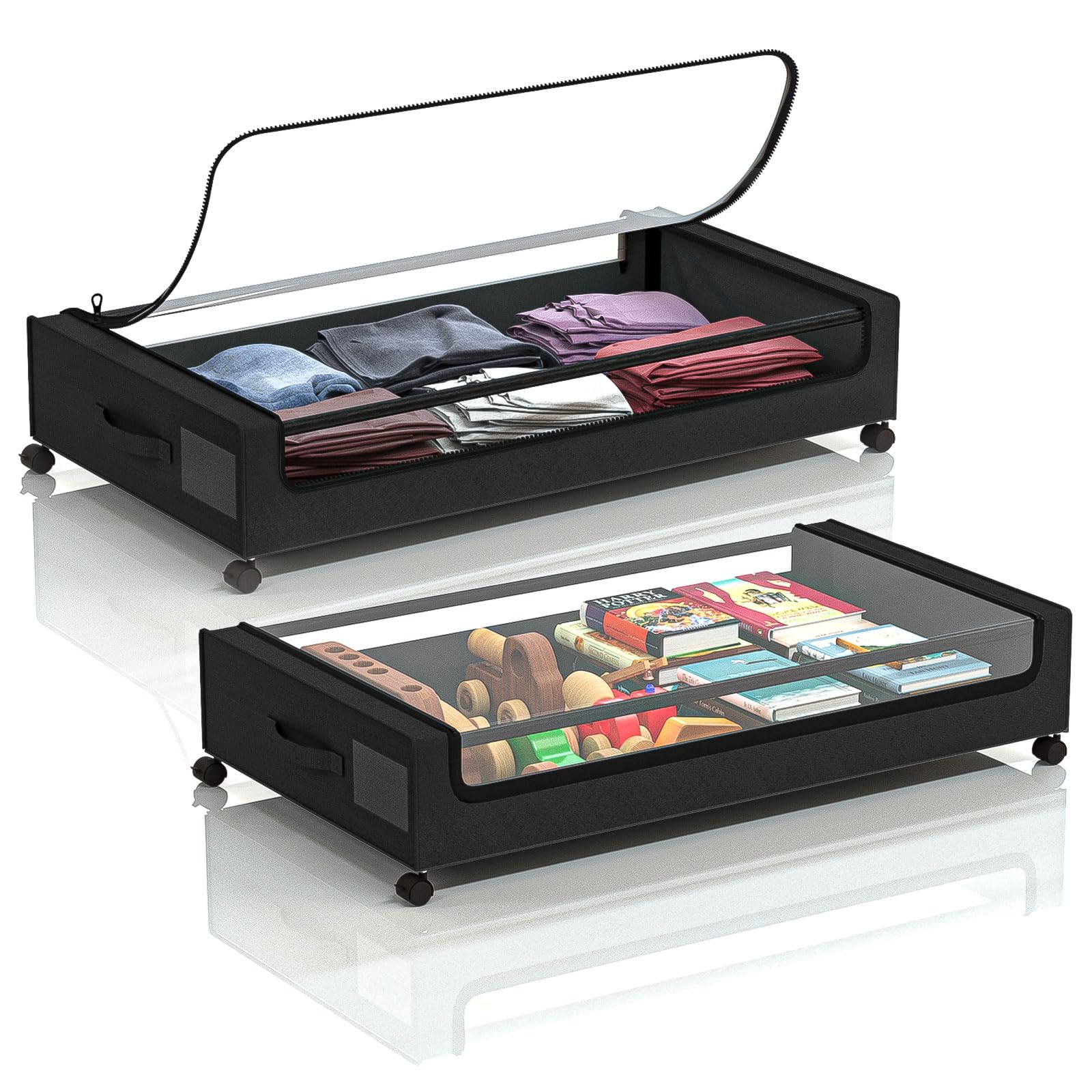 Absdefen ベッド下収納ボックス ベッド下収納ラック 服の収納ラック 大容量 ローラー付き 移動台車 ダストカバー付き 取り外し可能 ジッパー付き 収納ボックス 収納ケース 布団袋 書籍 雑貨 布団 毛布 介護用品 衣類収納 おもちゃ スペース活用 (ブラック布カバー 2個セット)
