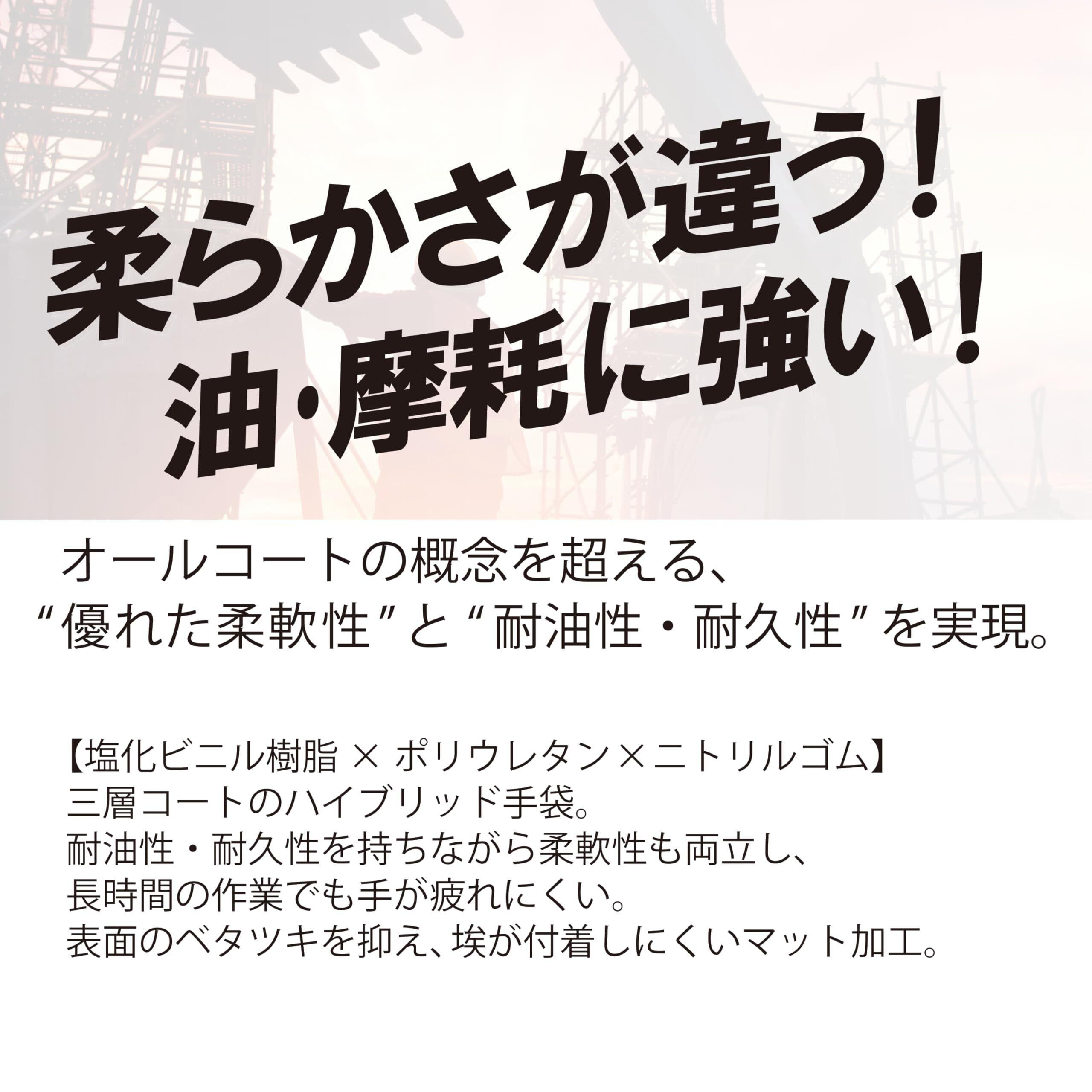 特殊製法により、オールコートでこの柔らかさを実現。ベタツキを抑えた表面マット加工+耐油性・耐久性・グリップ力を高めた三層コーティング。長時間の作業でも手が疲れにくい。