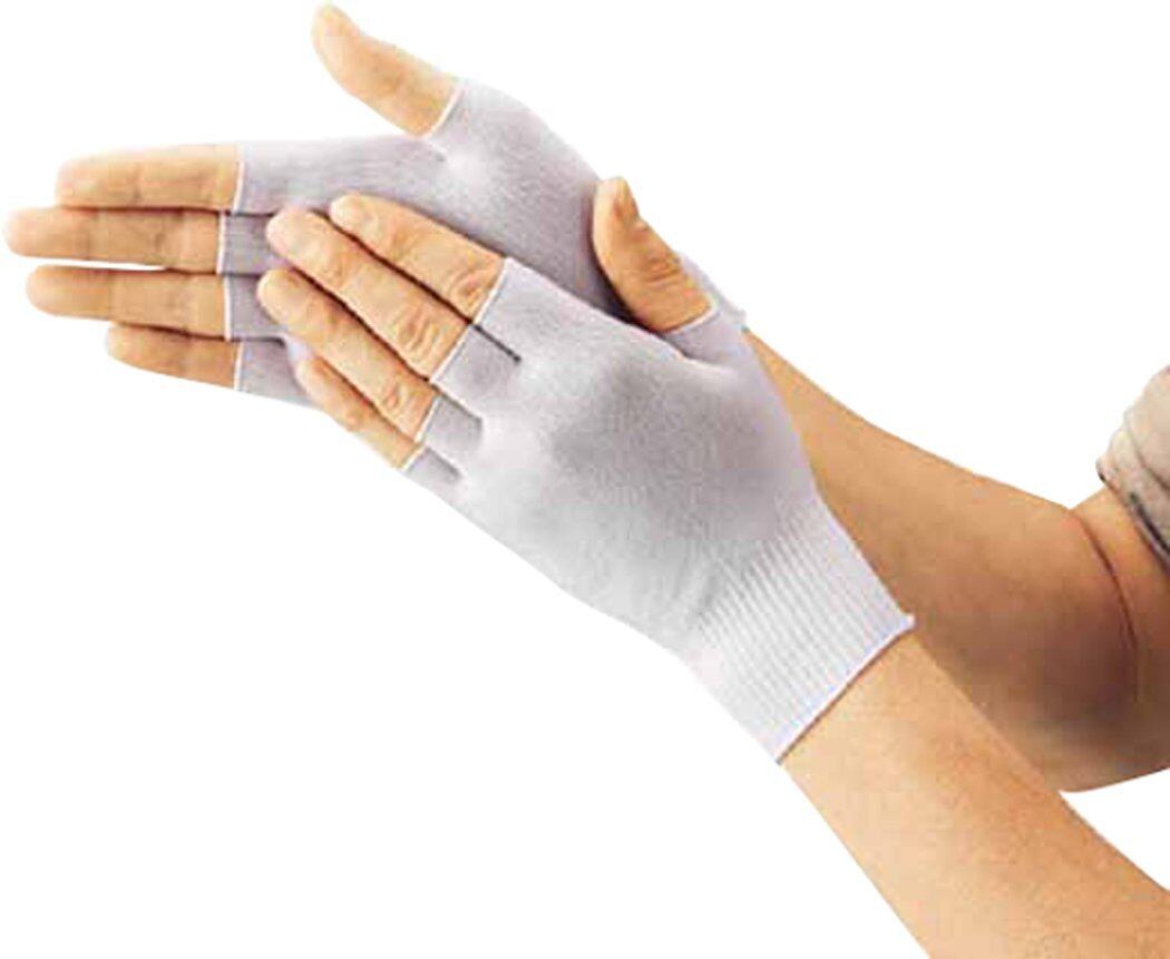 ●長繊維を使用したシームレス編みのため、快適に作業ができます。蒸れやベタ付きを押さえ、上ばきグローブからの着脱もスムーズです。洗濯で繰り返し使用が可能で経済的です。細かな作業に最適な半指タイプです