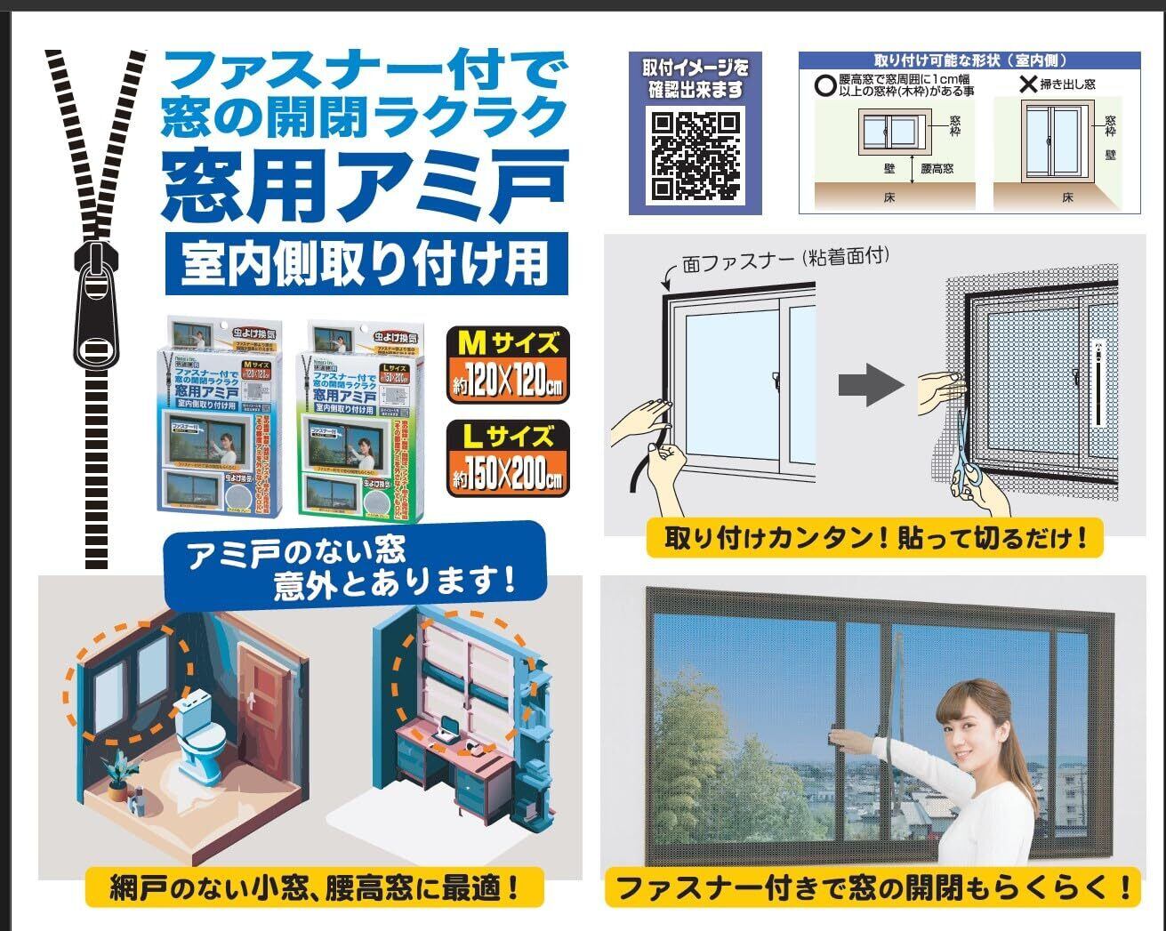 ●簡単取付!窓用網戸!ファスナー付で窓の開閉ラクラク!虫よけ換気にもおすすめ!(室内側取付用)
