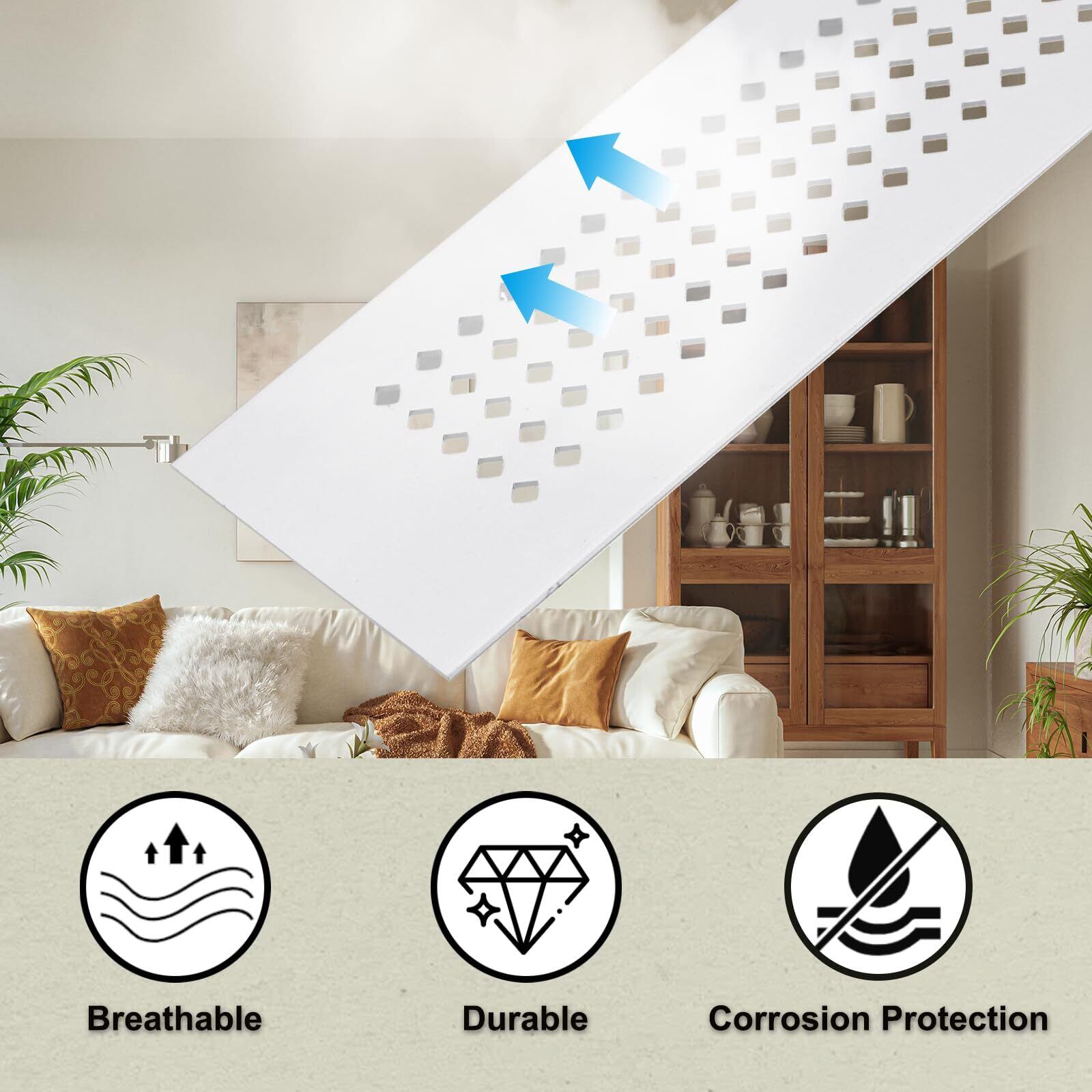 用途:この多目的なベントカバーは、バスルームやキッチンなどに適しています。キャビネット、ワードローブなどで使用するのに適しており、機能性と美的魅力を兼ね備えています。さまざまなインテリアスタイルを完成させ、居住空間全体の外観を向上させます
