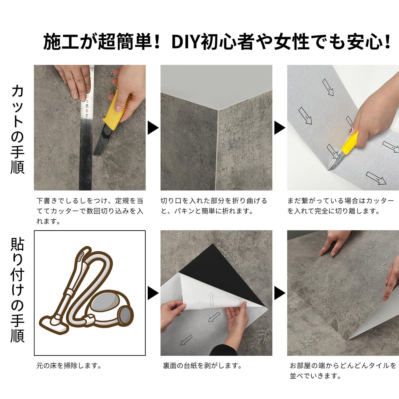 【施工簡単】裏面には粘着性があり、滑らかで乾燥した平面にシールのように床にペタッと貼るだけです。お部屋の形に合わせて、カッター1本で加工できるのでDIY初心者でも安心!一枚一枚は小さいサイズ感なので女性でも負担が少ない床材です。