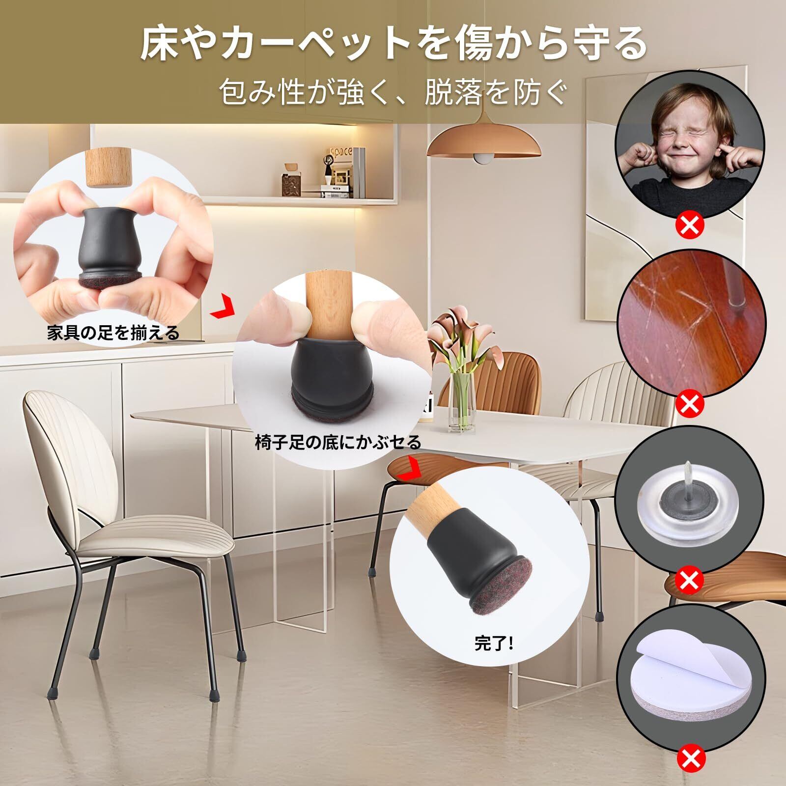 【多機能で簡単な取り付け】 この椅子脚カバーは床の損傷や騒音の防止、滑りやすさ、カビや湿気の防止、そして繰り返し使用が可能です。カバー内側には特殊な防滑溝があり、長時間の使用でも脱落しません。指先で軽く押すだけで、椅子の脚を完璧に包み込むことができます。