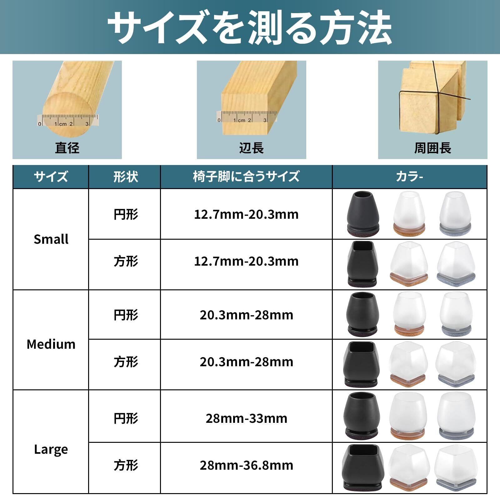 [パッケージ内容]フェルト椅子脚カバ x 16個。Small-適応サイズ :椅子脚の直径範囲 14mm - 19mm。ご注文の際、お手持ちの家具脚のサイズをよくお測りください。