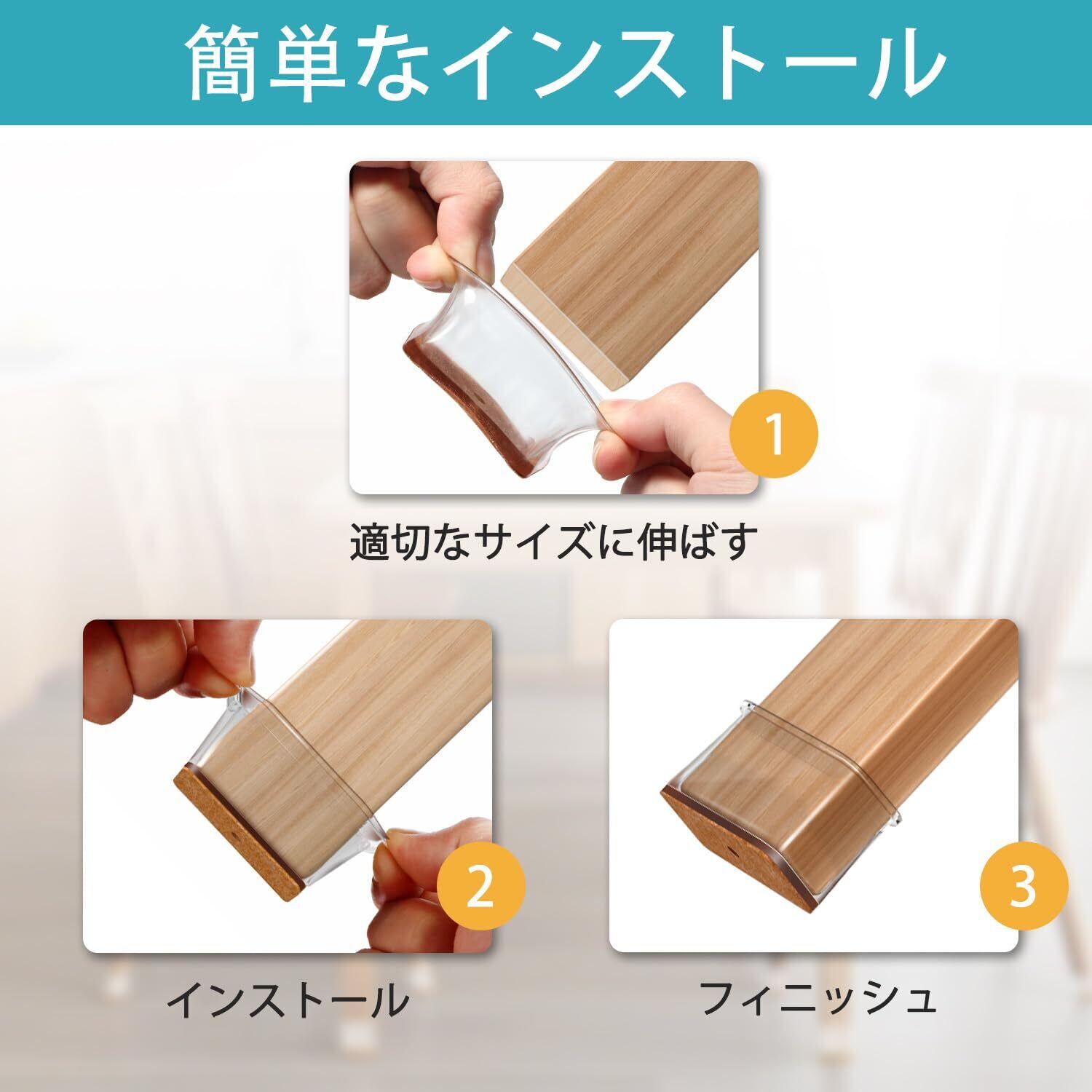 伸縮性のある素材で: 特別な工具なしで簡単に椅子の脚に装着できます。さまざまなサイズに対応し、しっかりと固定されて安心です