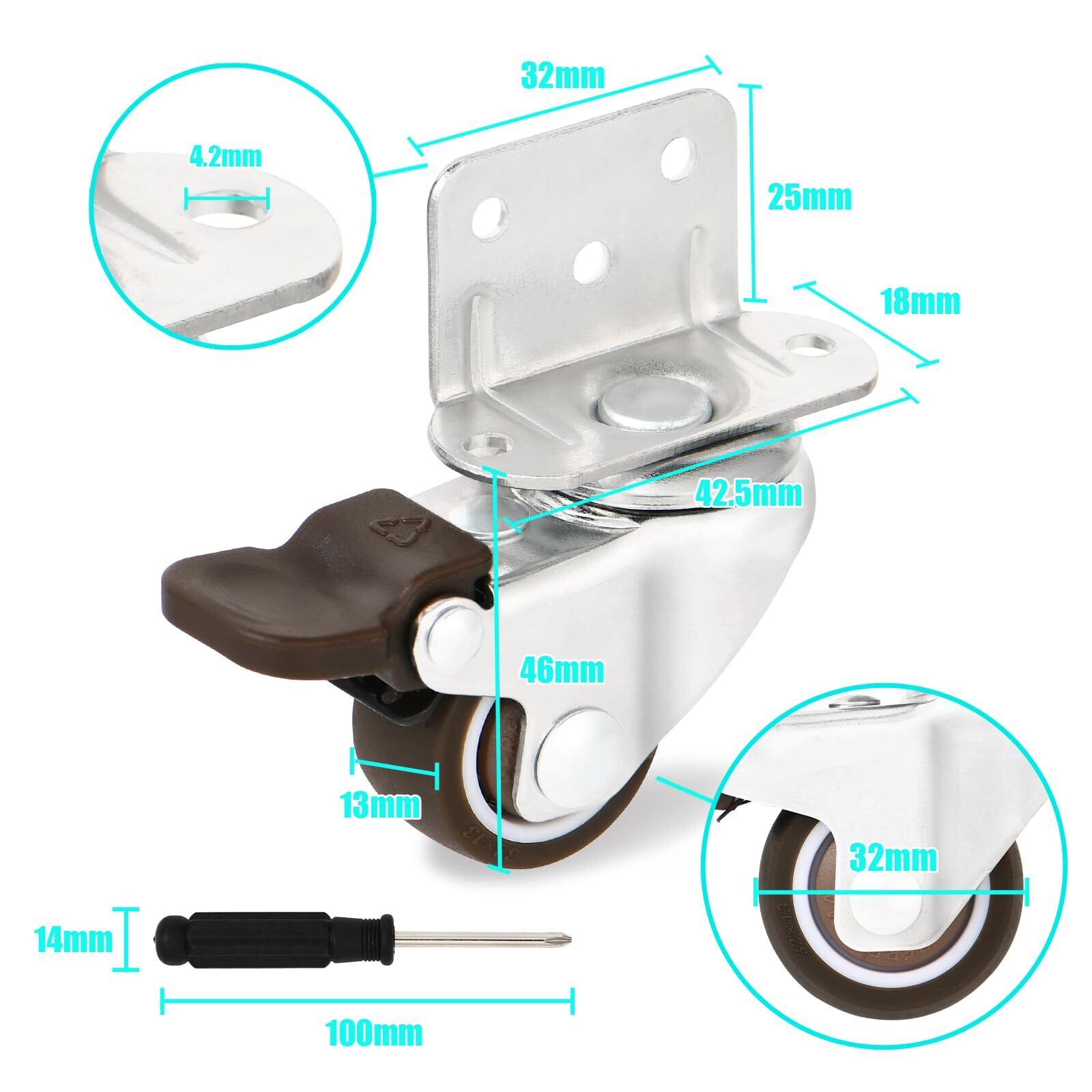 1輪の許容荷重:16kg 車輪径:32mm 車輪幅:13mm 取付高:46mm 梱包内容:32mmブレーキキャスター*2 、32 mmノンブレーキキャスター*2、ネジの*2袋(1袋/10個)、ドライバー*1。 狭いスペースでの家具やその他の家具の移動に最適なキャスターです。