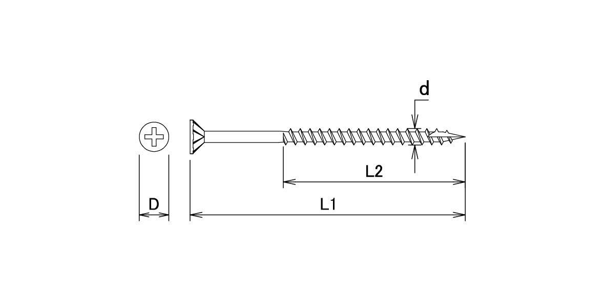 ねじ部L2:13mm。頭径D:6mm。材質:SWRCH22A。ビット:十字No.2。 軸部が細く、パーカー処理により木材への負担を軽減し打ち込みスピードを上げました。