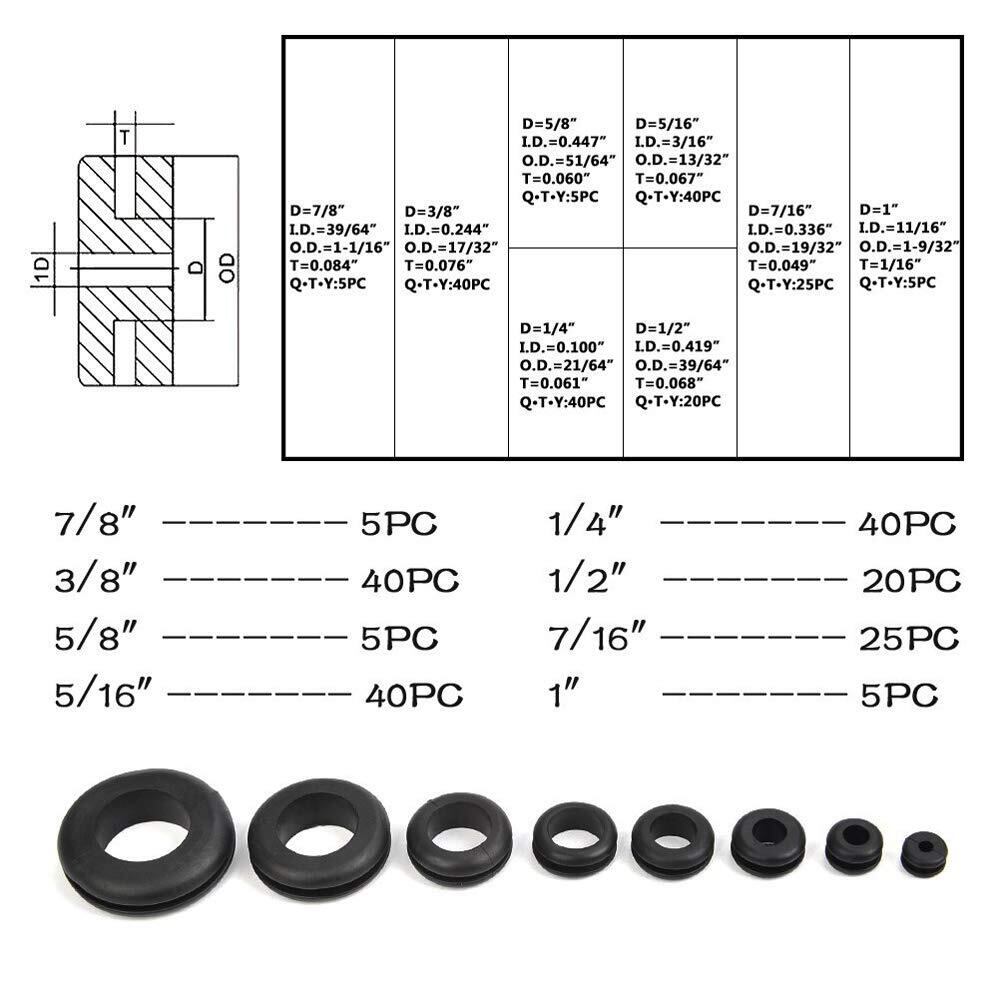 数・サイズ:5pcs-7/8"(22mm)、40pcs-3/8"(9.5mm)、5pcs-5/8"(16mm)、40pcs-5/16"(8mm)、40pcs-1/4"(6mm)、20pcs-1/2"(12.7mm)、25pcs-7/16"(11mm)、5pcs-1"(25.4mm)