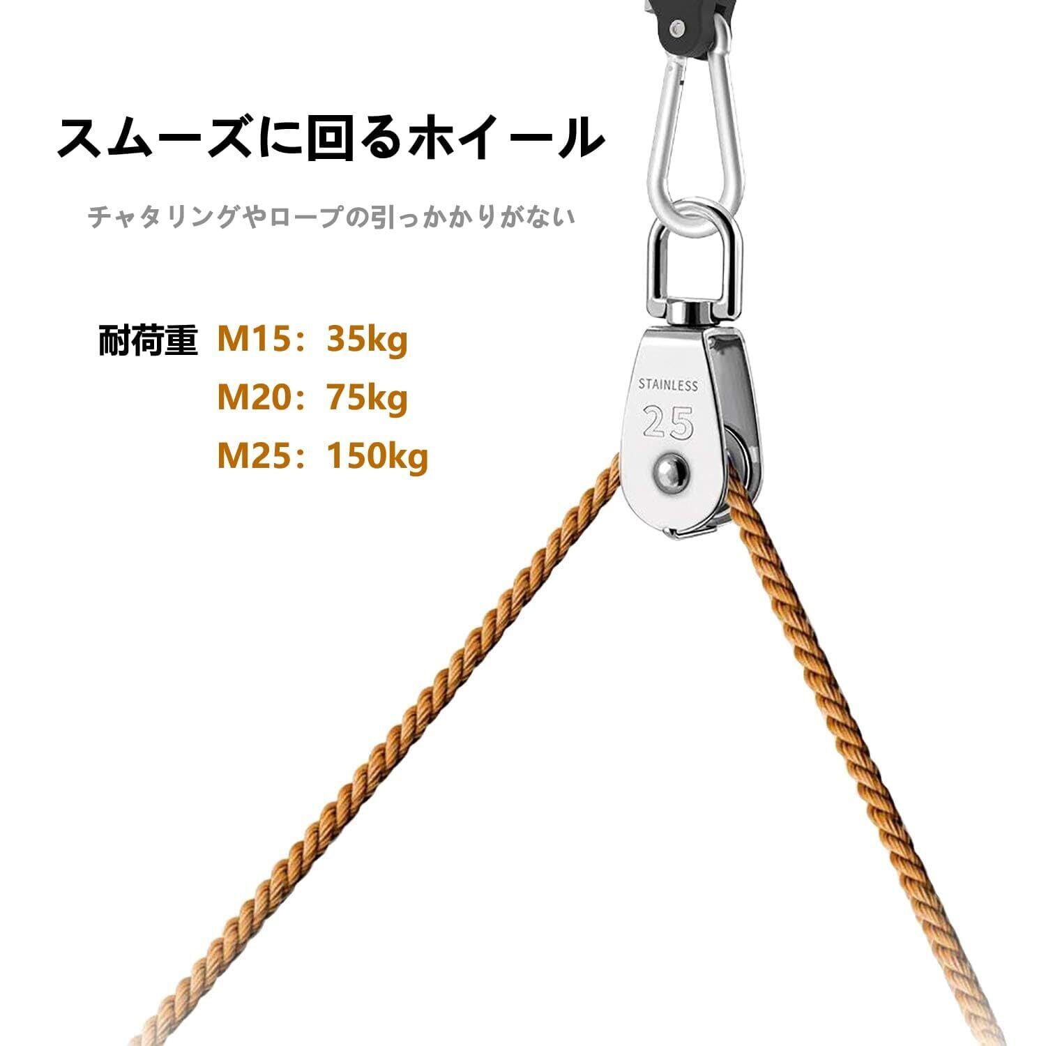 【使用荷重】:M25の滑車は150kgの重さを安全に支えることができ、最大で11mmのロープを使用できます。
